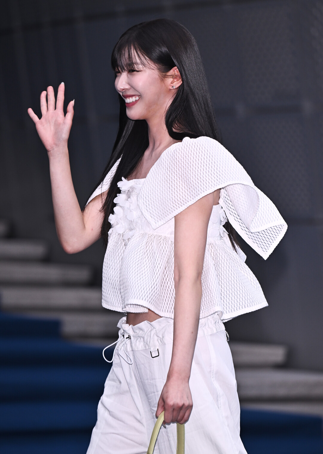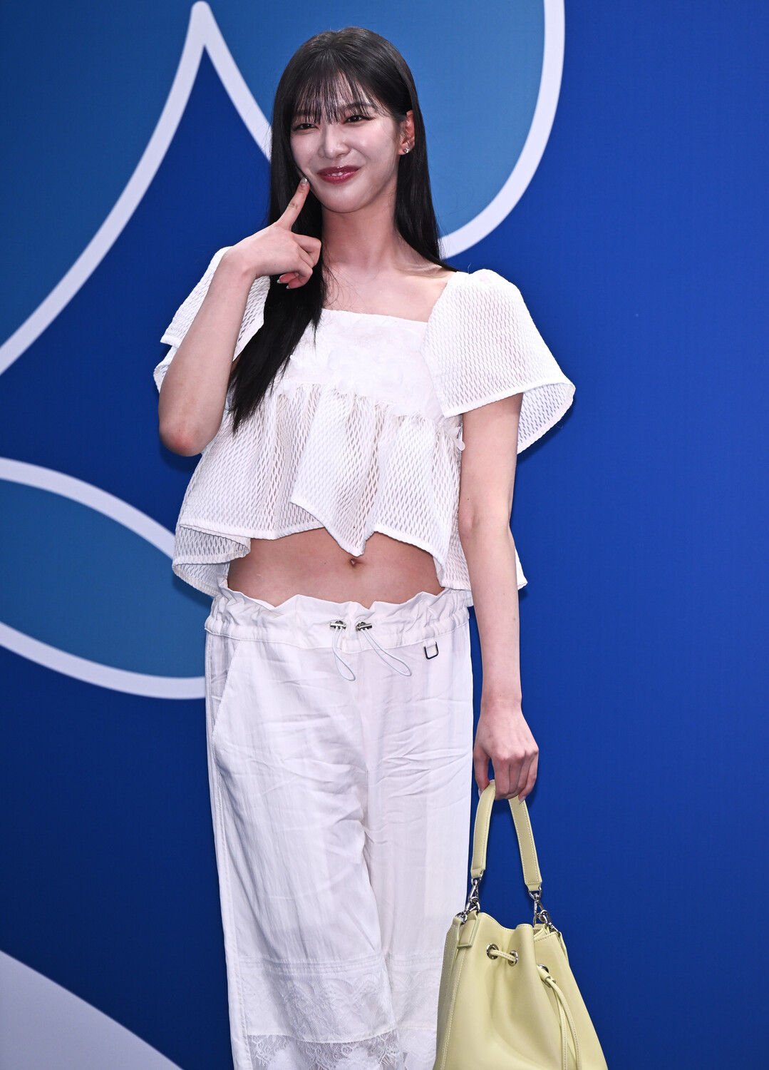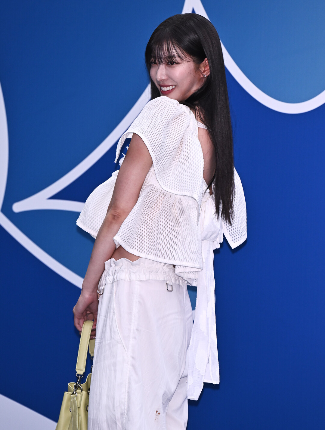 하의는 드로스트링 웨이스트의 화이트 와이드 팬츠를 매치했다. 하단부에는 시스루 레이스 소재와 플라워 자수 패턴이 레이어드돼 상의와 일관된 로맨틱 감성을 이어갔다. 옐로 그린 컬러의 드로스트링 버킷백이 올 화이트 룩 속 싱그러운 컬러 포인트로 기능하며 봄·여름 시즌 감각을 배가시켰다. 화이트 스니커즈로 마무리해 전체적인 룩에 경쾌하고 활동적인 무드를 더했다. 스터드 이어링이 유일한 주얼리로 절제미를 살렸다.
