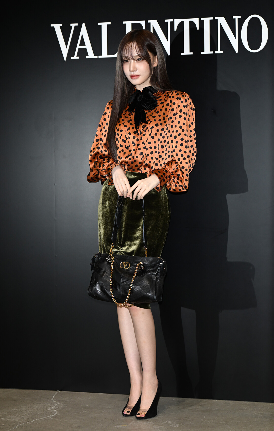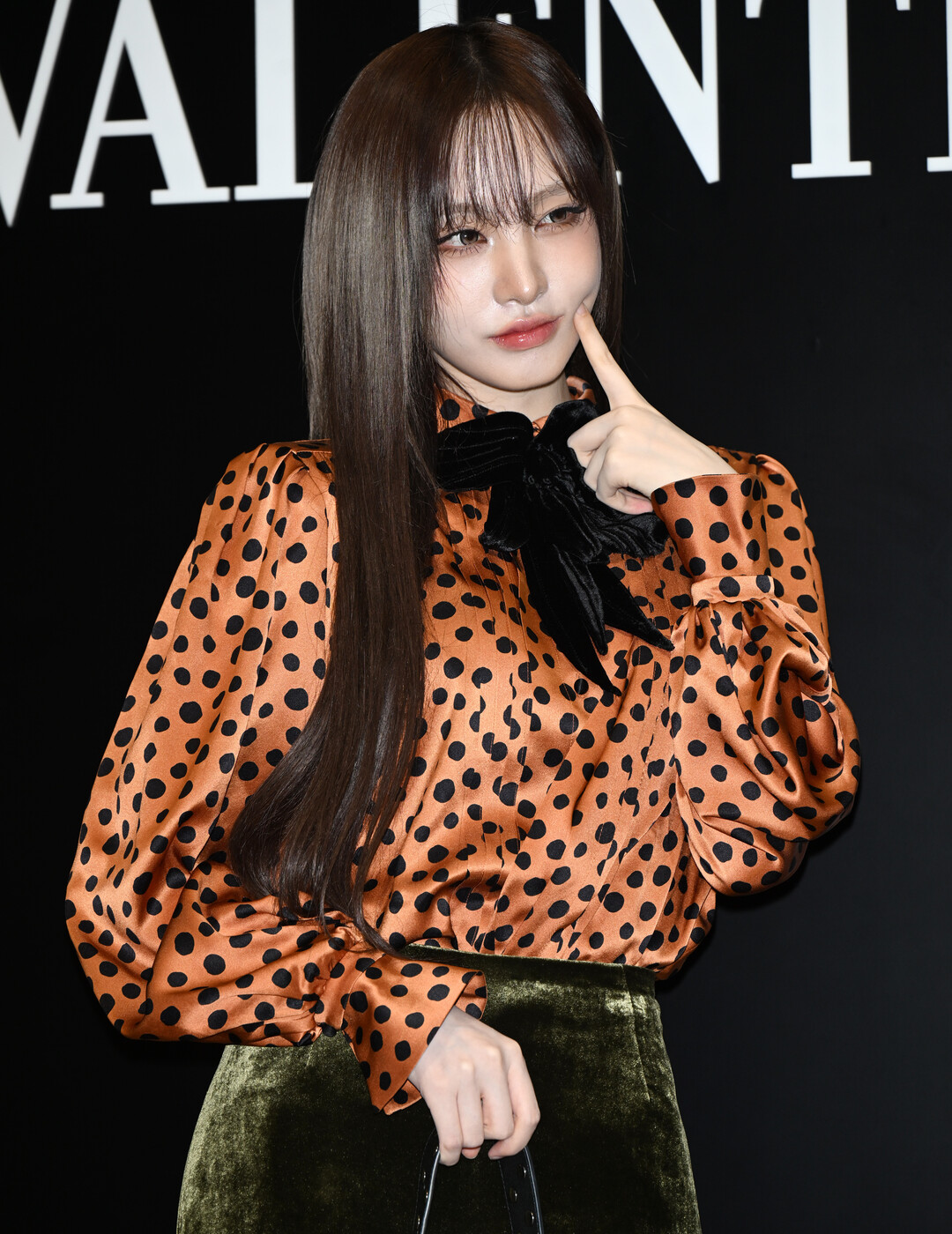 오렌지 폴카닷 블라우스와 올리브 벨벳 스커트…대담한 색채의 향연