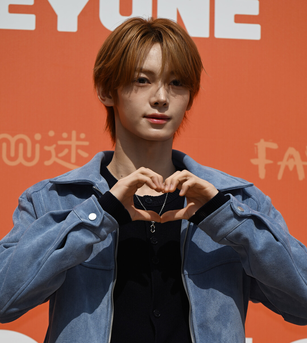 해이원의 시그니처 오렌지 컬러의 포토월 앞에서 한진의 블루 톤 재킷은 보색 대비 효과를 발휘하며 시각적 임팩트를 극대화했다. 웨이브 없이 자연스럽게 내린 구릿빛 브라운 헤어는 블루와 오렌지 사이에서 따뜻한 중간 톤으로 전체 컬러 팔레트를 조화롭게 연결했다. 포토월 앞에서 손하트, 양손 핑거하트, 아트토이를 들어 보이는 등 다채로운 포즈를 소화하며 풍부한 화보 컷을 선사했다.