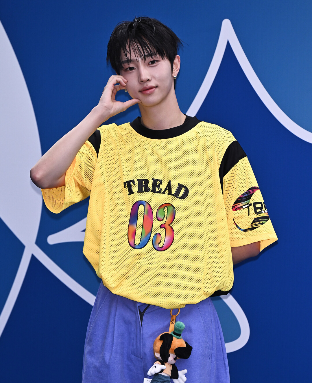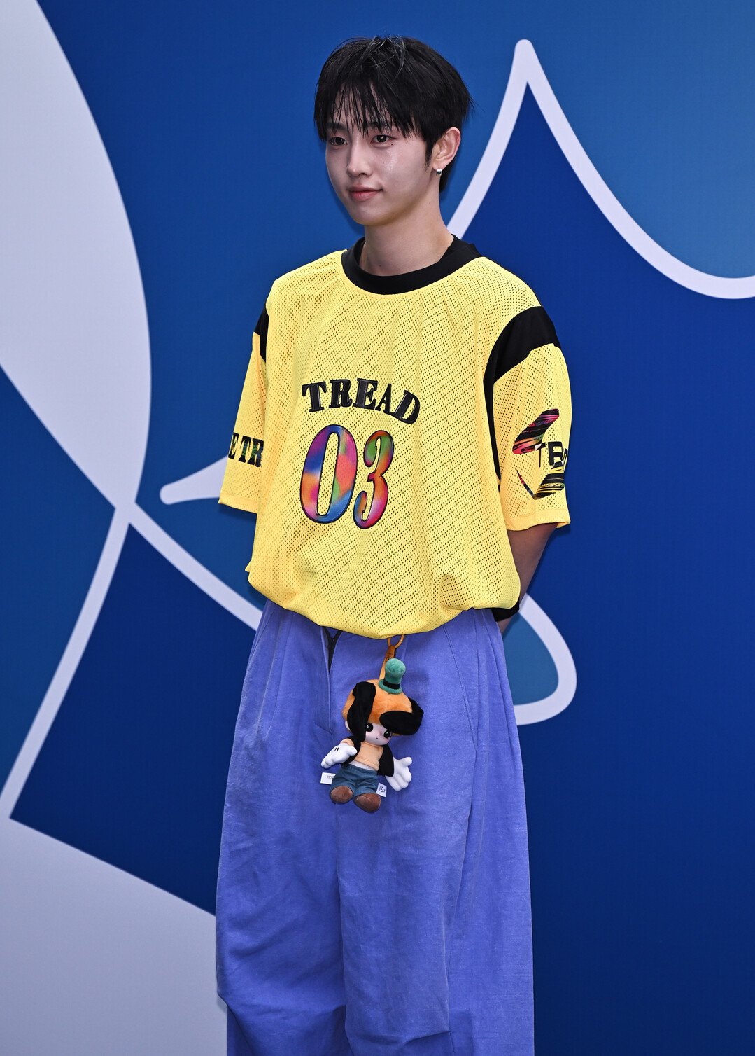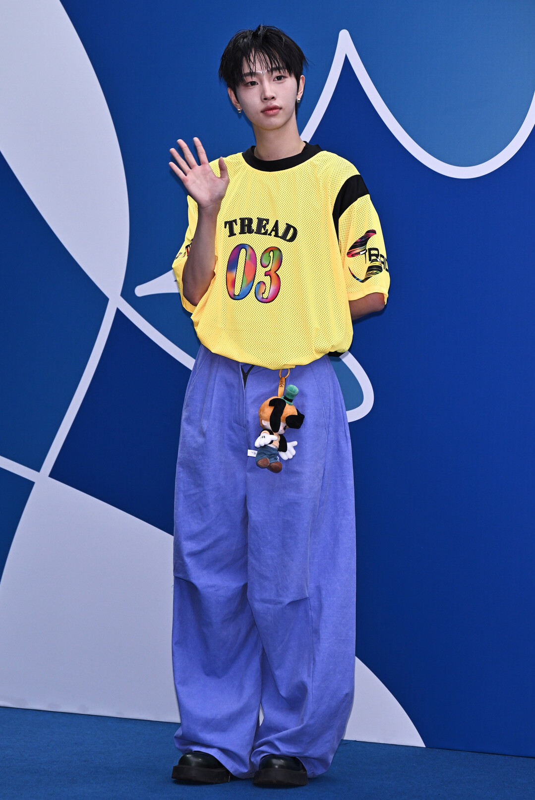 허리춤에 매달린 캐릭터 인형 키링이 룩의 키치한 포인트로 눈길을 끌었으며, 이협의 천진난만한 소년미와 절묘하게 어우러졌다. 스터드 이어링 하나로 액세서리를 절제해 전체적으로 깔끔하면서도 개성 있는 완성도를 높였다.