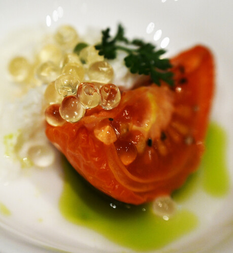 사진 속 카프레제는 전통적인 방식에서 한 걸음 더 나아간 현대 파인다이닝 버전이다. 완숙된 토마토를 저온에서 천천히 컨피(confit) 처리해 당도와 감칠맛을 극대화했고, 그 위에 투명한 구슬 형태의 발사믹 펄(balsamic pearl)을 올려 시각적 완성도와 맛의 집중도를 동시에 높였다. 허브 오일의 선명한 초록빛이 접시 위에 번지며 전통적인 카프레제에 현대적 감각을 더한다.