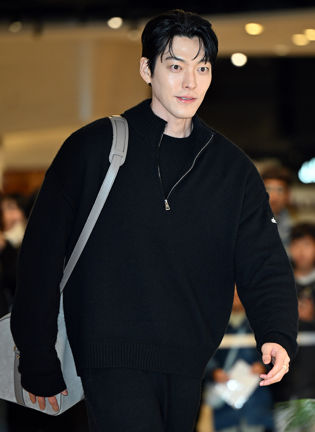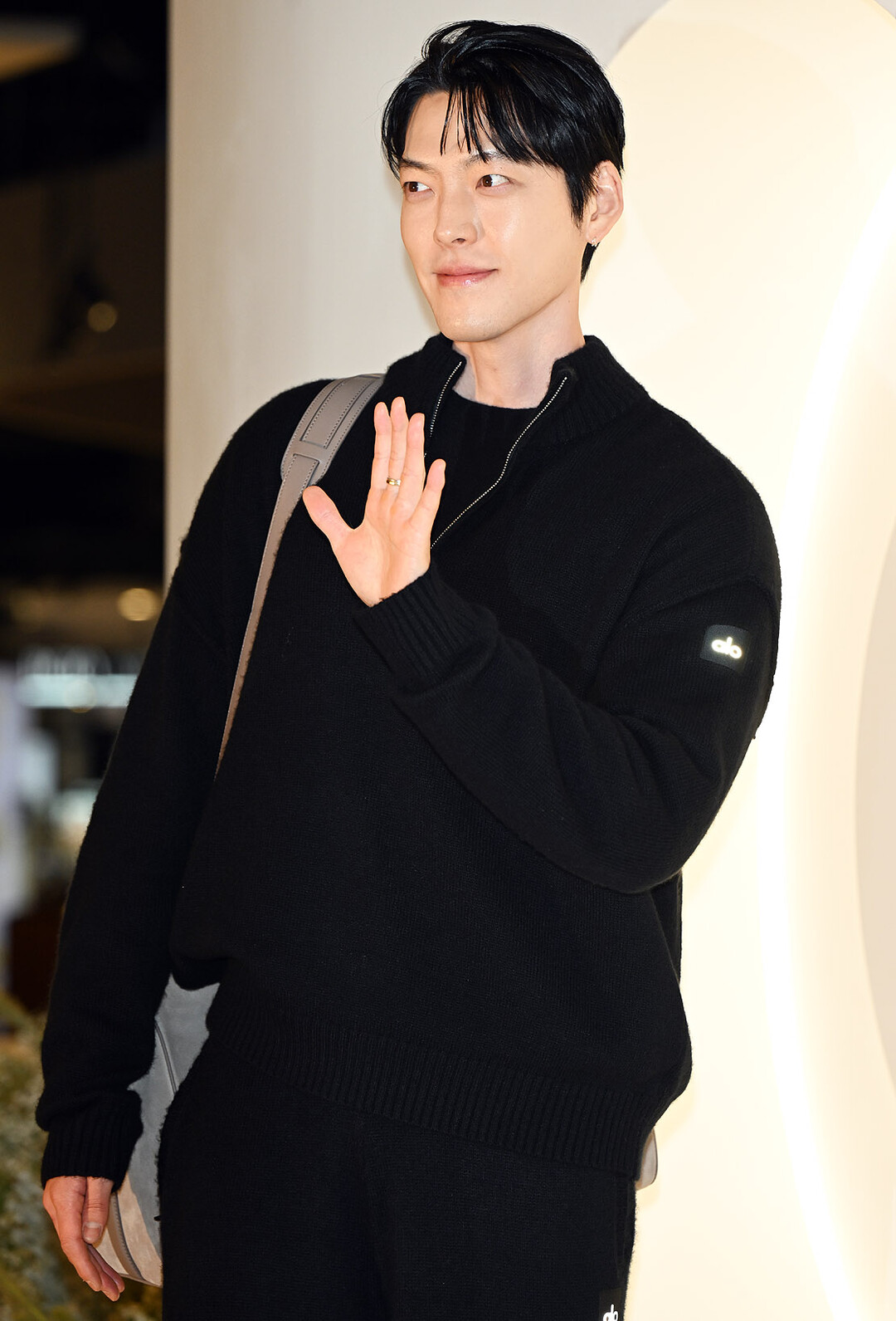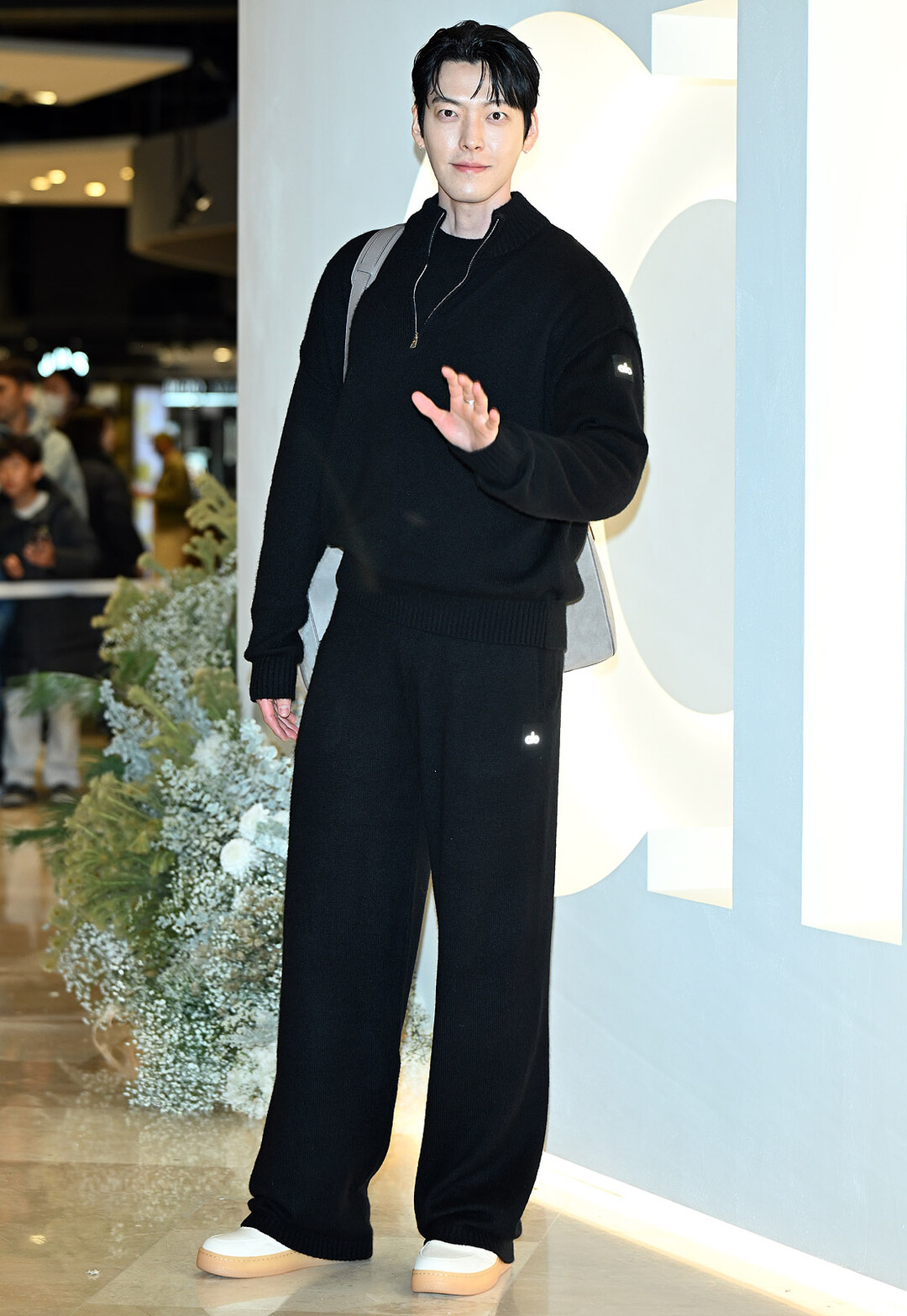 이날 김우빈은 블랙 오버사이즈 니트 스웨터와 와이드 핏 팬츠로 구성된 편안한 세트업 룩을 착용했다. 특히 여유로운 실루엣의 니트는 그의 넓은 어깨와 긴 팔다리 비율을 자연스럽게 강조하며 모델 출신답게 어떤 스타일도 완벽하게 소화하는 능력을 입증했다.