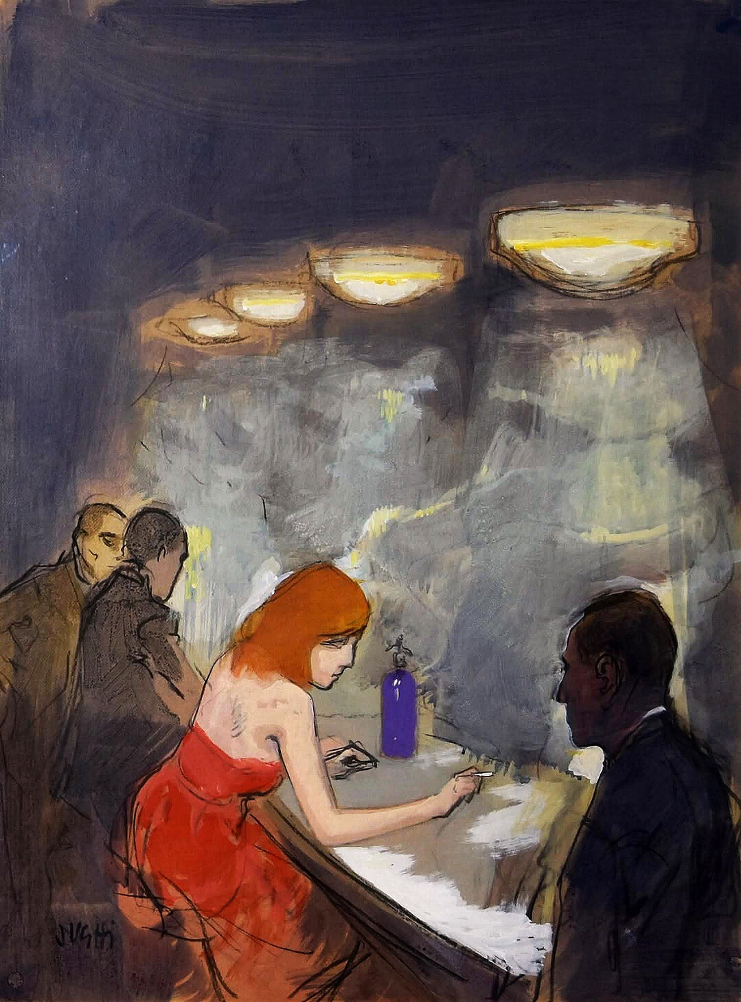작품은 어두운 바 내부를 배경으로 네 개의 둥근 조명이 천장에 매달려 있고, 그 아래로 희미한 스모그가 공간을 채운다. 화면 전경에는 빨간 드레스를 입은 주황색 머리 여성이 바 테이블에 앉아 검은 정장의 남성과 마주하고 있다. 두 사람 사이 테이블 위에는 보라색 병이 놓여 있다. 배경 왼쪽에는 두 남성이 밀착되어 서 있으며, 한 명은 베이지색 코트를, 다른 한 명은 어두운 옷을 입고 있다.