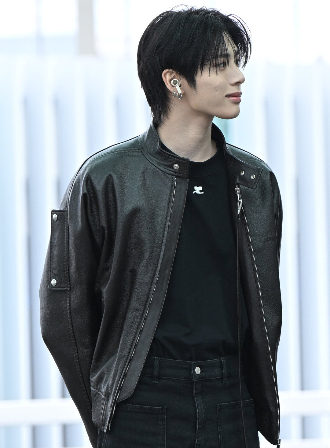 재킷 안으로는 쿠레주(Courrèges) 시그니처 로고가 새겨진 블랙 티셔츠를 레이어드했다. 가슴에 브랜드 특유의 스페이스 에이지 로고가 화이트로 포인트를 이루며, 올블랙 스타일링 안에서 브랜드 감도를 은근하게 드러내는 역할을 했다. 하의는 블랙 와이드 데님 팬츠로 매치해 상체의 오버사이즈 재킷과 자연스러운 볼륨 밸런스를 이뤘다.