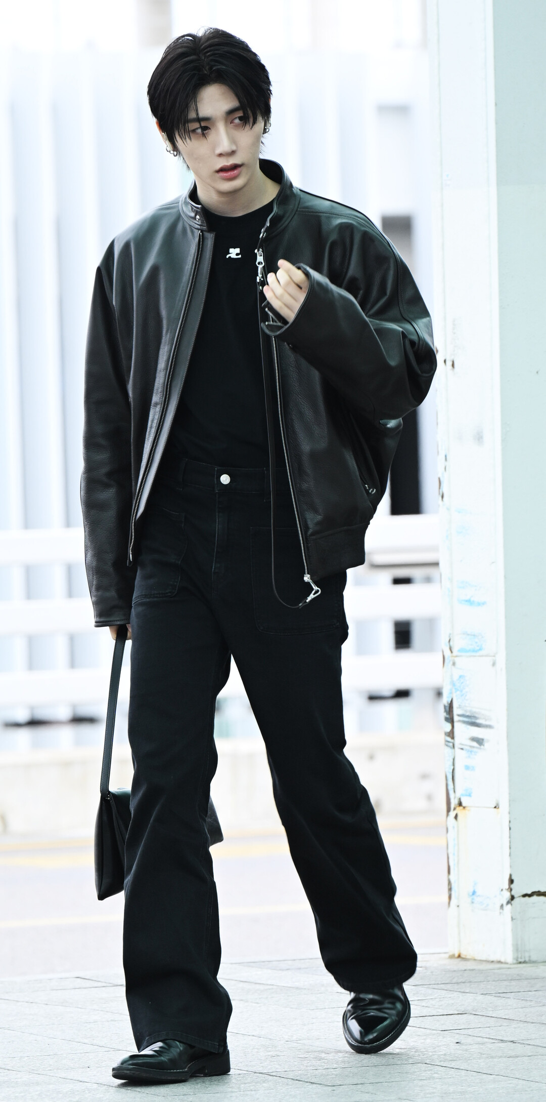 오버사이즈 실루엣임에도 불구하고 태산의 넓은 어깨와 긴 팔 라인이 재킷의 구조적인 형태를 훌륭하게 받쳐내며, 평범할 수 있는 블랙 레더 재킷을 그만의 방식으로 완전히 소화해냈다.