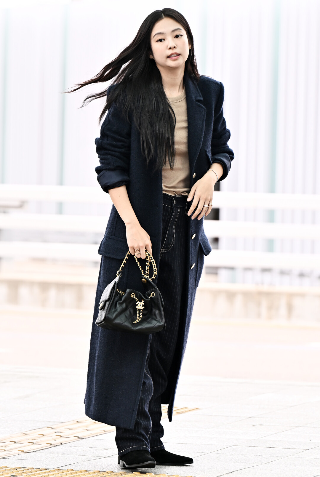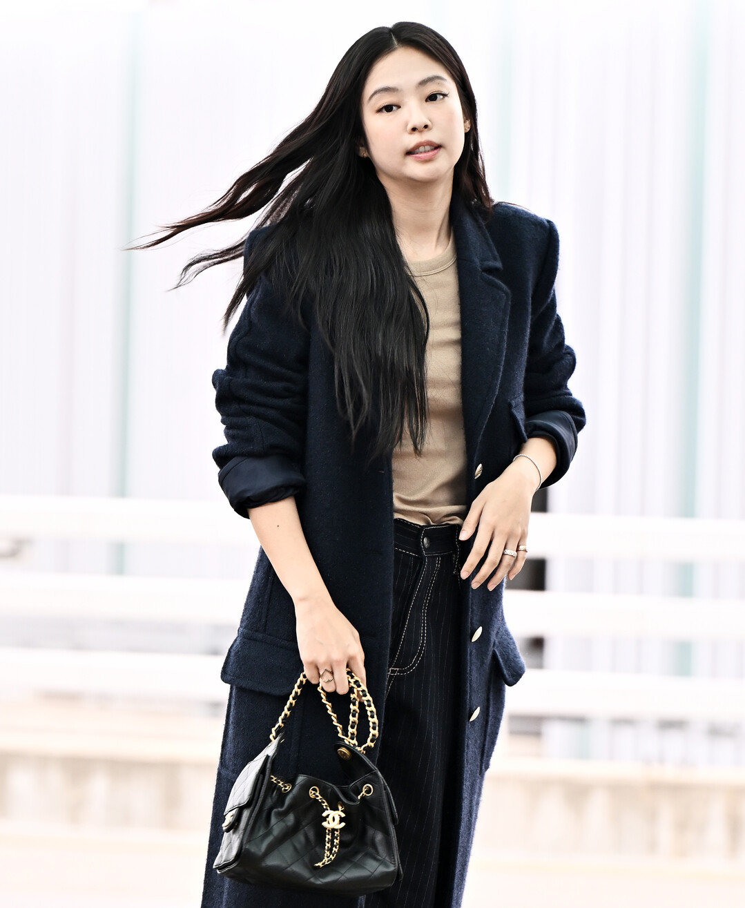 이날 제니는 네이비 롱코트에 베이지 니트, 블랙 핀스트라이프 와이드 팬츠를 매치했다. 골드 버튼이 포인트인 오버사이즈 코트는 클래식한 실루엣으로 편안하면서도 고급스러운 분위기를 연출했다. 샤넬 시그니처 퀼팅 블랙 미니백과 심플한 실버 액세서리로 럭셔리함을 더했다.