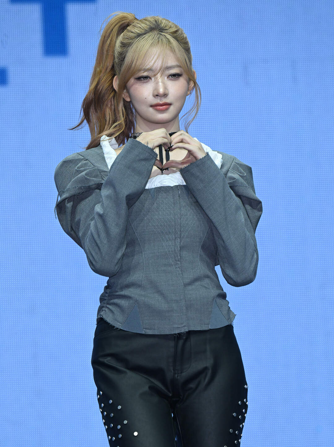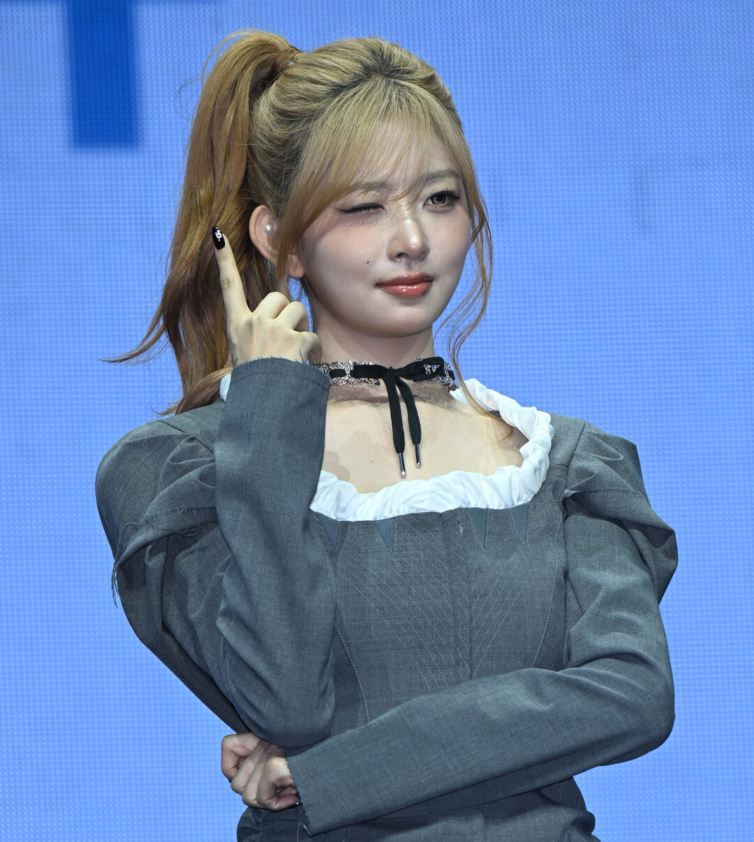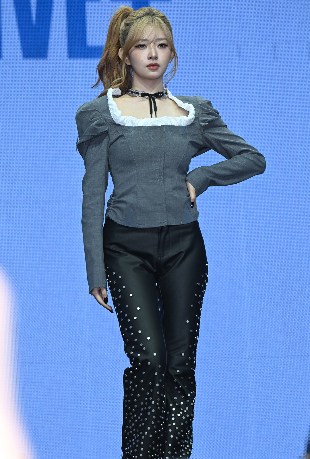 헤어 스타일링은 블론드 포니테일로 마무리했다. 높게 묶어 올린 포니테일이 목선과 어깨를 시원하게 드러내며 코르셋 재킷의 구조적 실루엣을 더욱 선명하게 부각시켰고, 앞머리가 레이 특유의 동글동글한 얼굴형을 한층 사랑스럽게 감쌌다. 올블랙 매니큐어로 손끝을 마무리하고 윙드 라인을 또렷하게 그린 아이 메이크업으로 존재감을 완성했다. 무대 위에서 경례 포즈를 취하거나 가슴 앞에서 손하트를 그리는 모습에서는, 강한 스타일링 속에서도 레이만의 싱그럽고 다정한 무대 매너가 자연스럽게 배어나왔다.