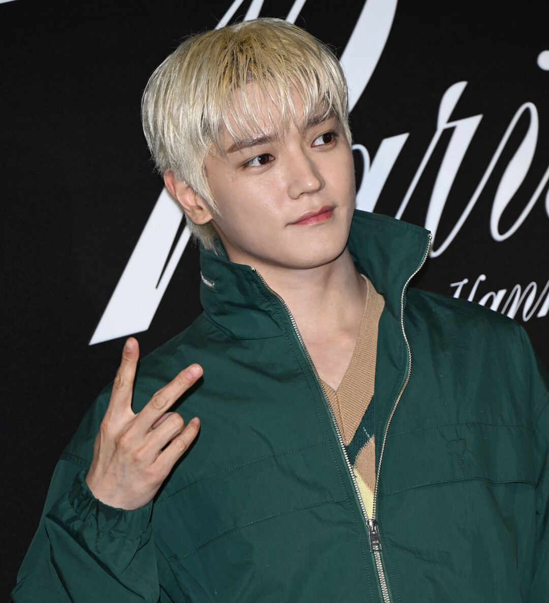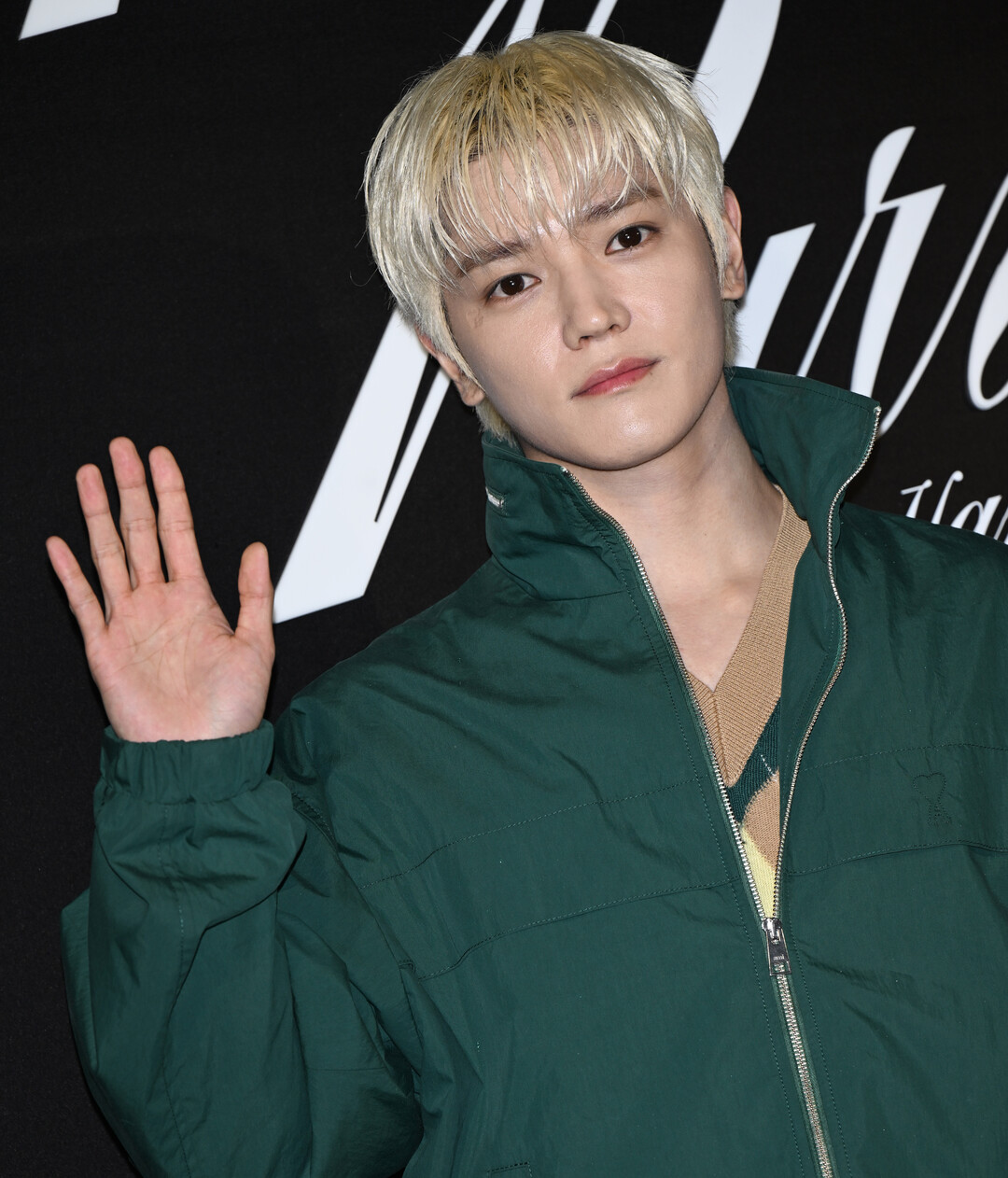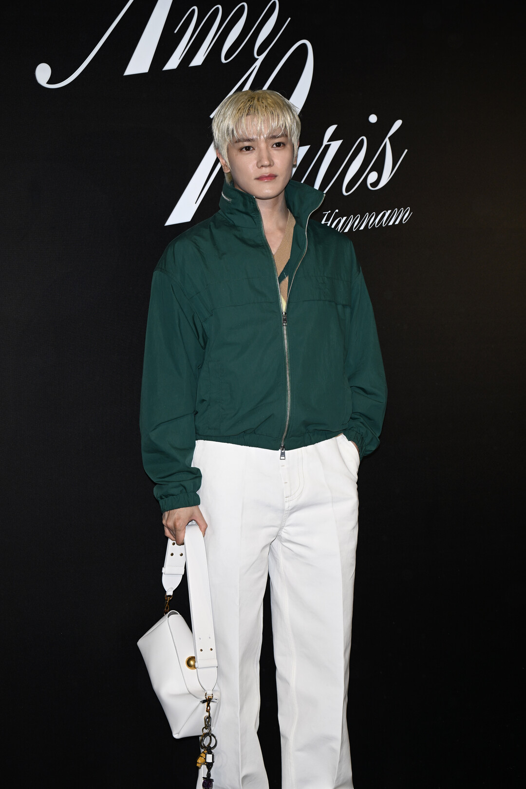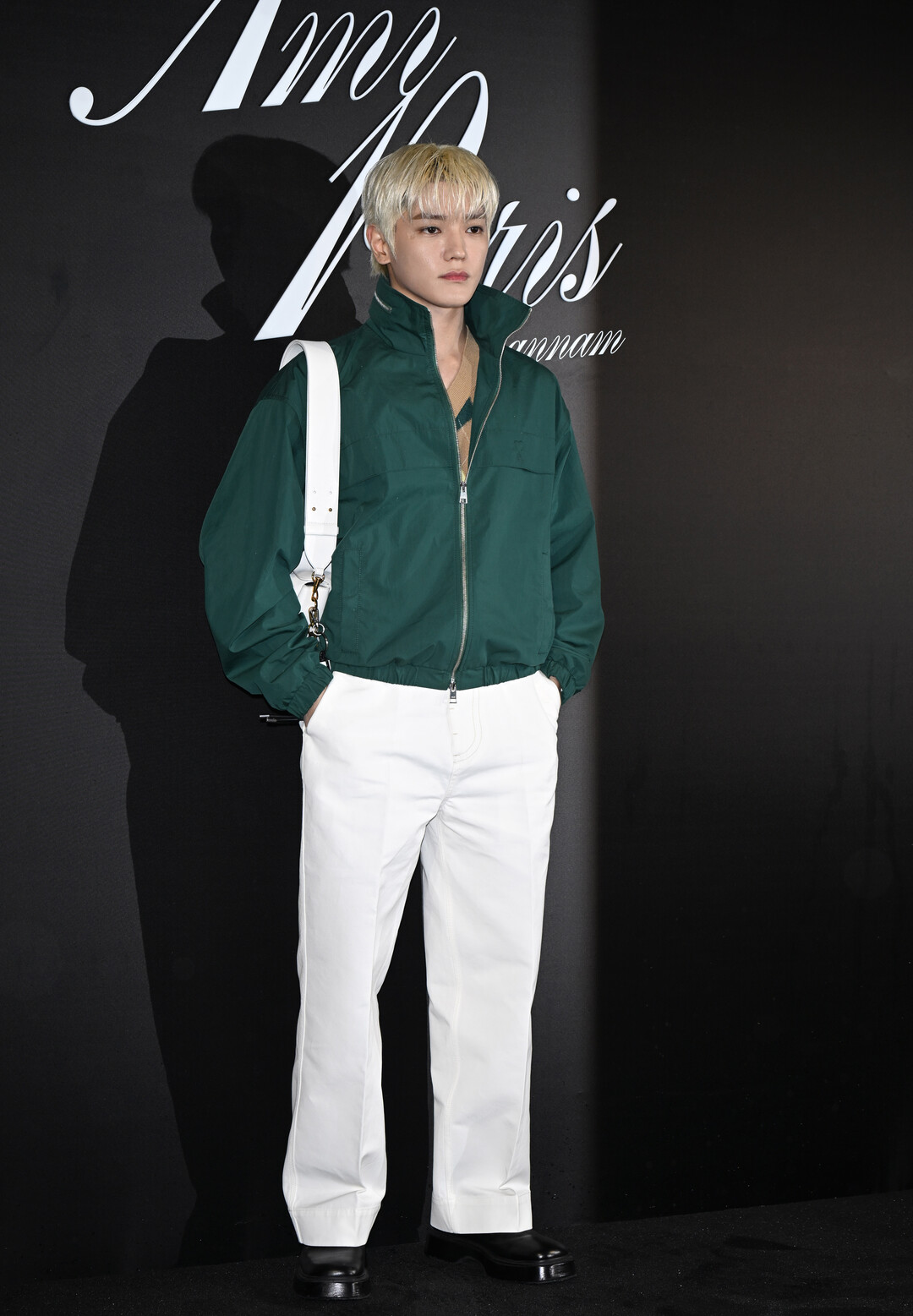 이날 태용은 딥 포레스트 그린 컬러의 오버사이즈 하이넥 집업 재킷에 와이드 핏 화이트 팬츠 를 매치해 강렬한 색채 대비를 연출했다.
