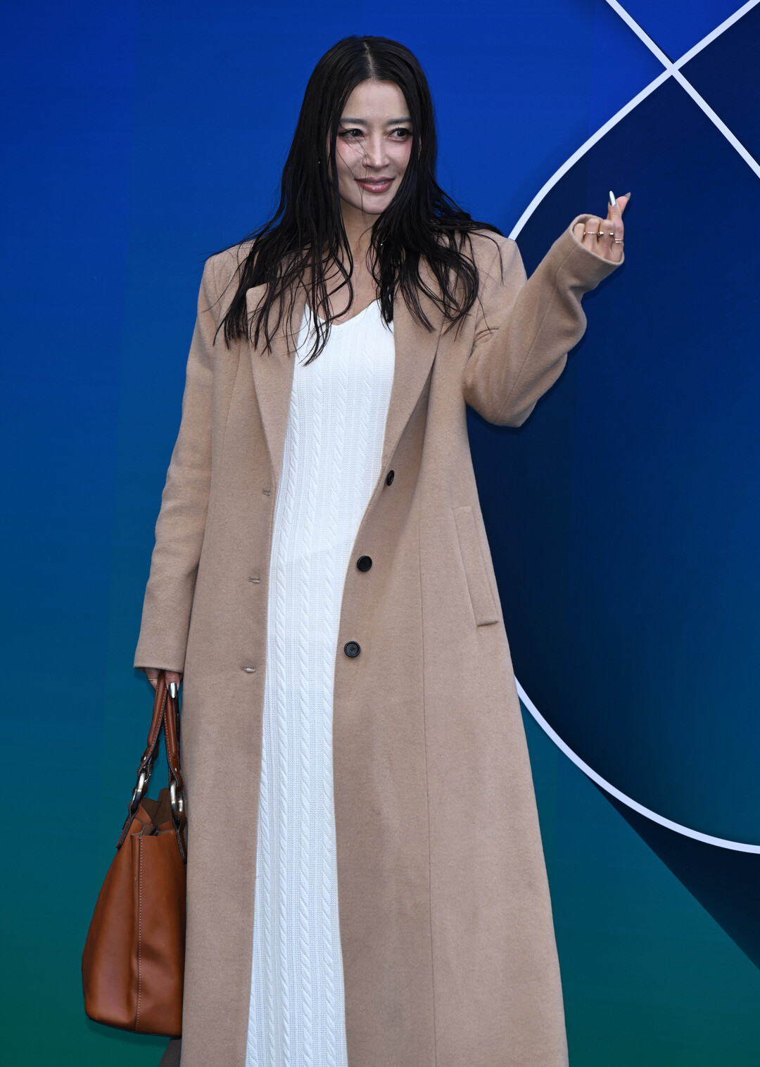 코트 안에는 V넥 라인의 화이트 니트 원피스를 레이어링했다. 원피스는 섬세한 케이블 니트 패턴이 돋보이는 디자인으로, 발목까지 내려오는 긴 기장이 우아한 실루엣을 완성한다. 화이트와 베이지의 조합은 부드럽고 깨끗한 이미지를 극대화하며, 전체적으로 차분하면서도 세련된 분위기를 연출했다.
