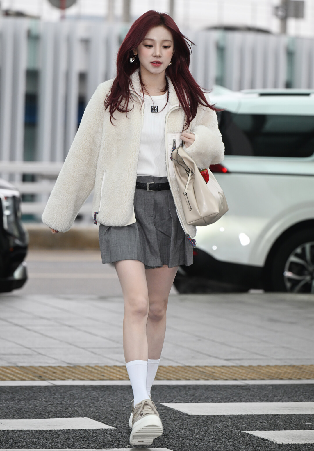 우기는 이날 오프화이트 컬러의 포근한 양털 재킷을 메인 아이템으로 선택했다. 부드러운 재질의 재킷은 겨울철 공항패션의 실용성과 패셔너블함을 동시에 충족시켰다. 화이트 티셔츠를 이너로 매치해 깔끔한 레이어드를 완성했으며, 블랙 벨트로 포인트를 준 그레이 톤의 플리츠 미니스커트가 발랄하면서도 시크한 분위기를 자아냈다.