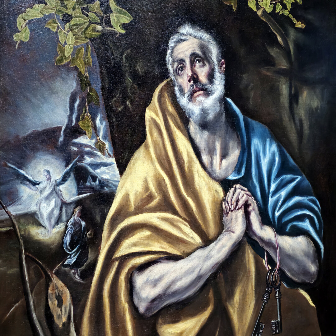 이 작품은 신약성서에 나오는 사도 베드로가 예수 그리스도를 세 번 부인한 후 깊은 회개에 빠진 순간을 담고 있다. 황금빛 망토와 푸른색 옷을 걸친 베드로는 눈물 어린 눈으로 하늘을 응시하며, 한 손에는 천국의 열쇠를 쥐고 있다. 이는 예수로부터 받은 천국의 문지기라는 사명과 자신의 나약함 사이에서 괴로워하는 인간적 고뇌를 상징한다.