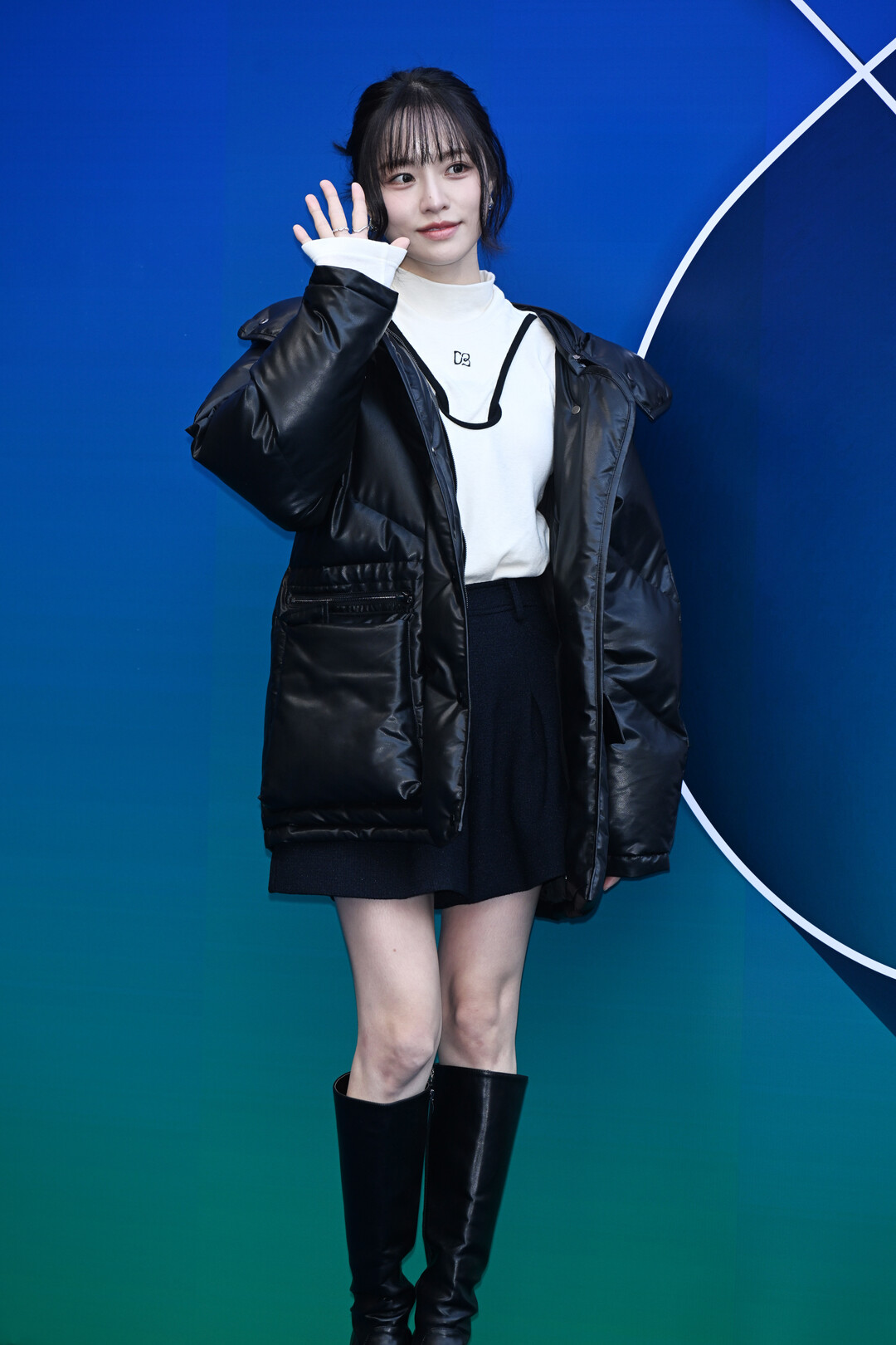 하의는 블랙 미니스커트로 과감한 다리 라인을 드러내며 청순함과 섹시함을 동시에 표현했다. 짧은 기장의 스커트는 패딩의 볼륨감과 대비를 이루며 균형 잡힌 실루엣을 완성했다. 발끝에는 블랙 니하이 부츠를 매치해 다리 라인을 더욱 길어 보이게 하는 동시에 전체적으로 시크한 스트리트 무드를 극대화했다. 청키한 굽의 부츠는 편안함과 스타일을 동시에 살린 선택이다.