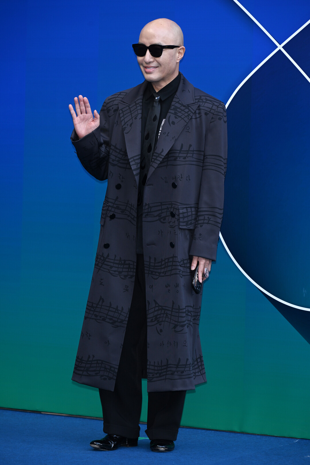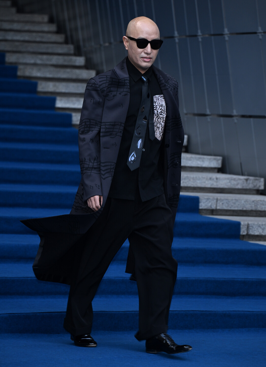 지난 6일 서울 중구 동대문디자인플라자(DDP)에서 개최된 디자이너 이청청의 라이(LIE) 컬렉션 쇼에 참석한 홍석천은 음표가 새겨진 블랙 더블 코트로 포토월을 장악했다. 무릎까지 내려오는 롱 코트에는 오선지와 음표 패턴이 전면에 프린트되어 있어 예술적 감성을 한껏 드러냈다.