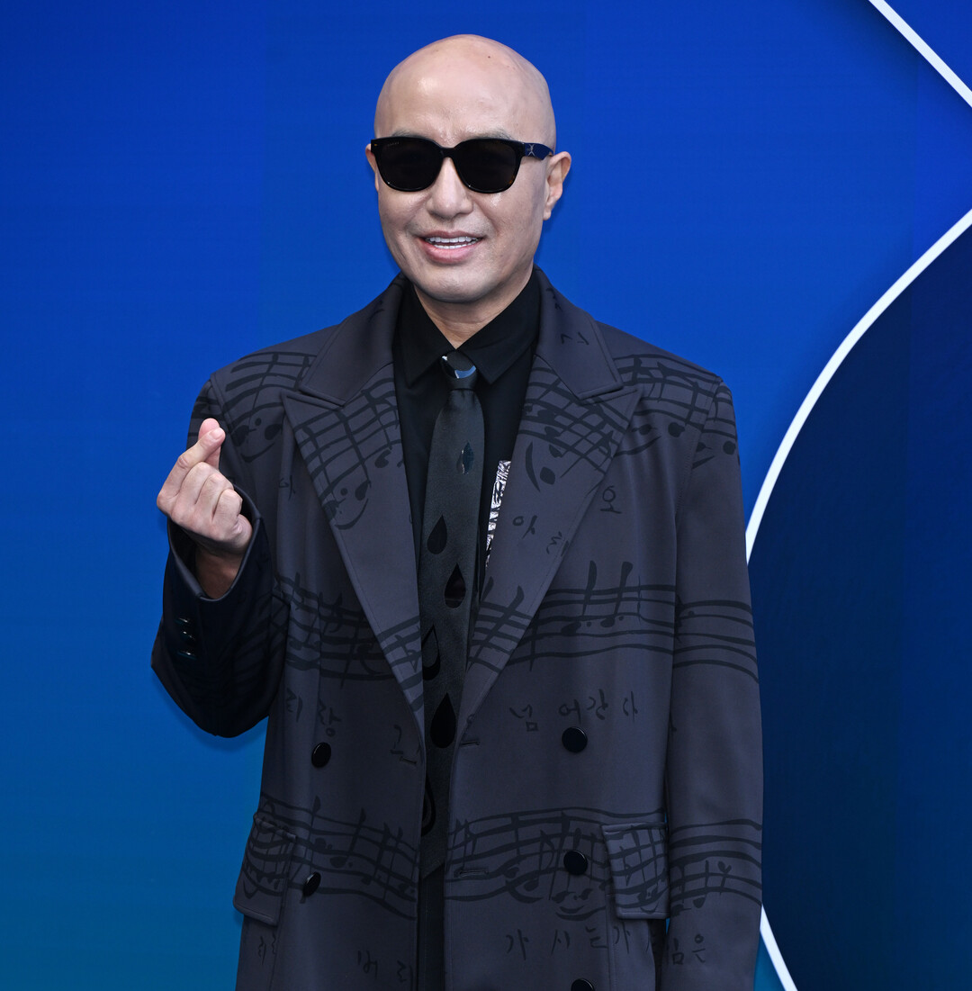 홍석천은 블랙 셔츠와 타이, 블랙 팬츠로 구성된 올블랙 정장 위에 음악적 요소가 가미된 코트를 레이어드하며 세련된 모던 룩을 완성했다. 특히 가슴 부분에 장식된 실버 톤의 브로치가 블랙 앤 블랙 조합에 포인트를 더했다.