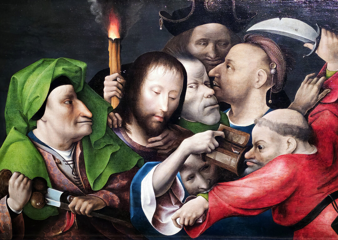 '그리스도의 체포'는 예수 그리스도가 겟세마네 동산에서 체포되는 순간을 포착한 작품이다. 화면 중앙에는 온화한 표정의 그리스도가 배치되어 있으며, 그를 둘러싼 인물들의 일그러진 얼굴과 극명한 대조를 이룬다. 배신을 저지른 유다(상단 검은 모자의 인물)는 눈치를 보며 현장을 빠져나가려 하고 있고, 사도 베드로는 로마 병사들을 향해 칼을 들어 올린다.