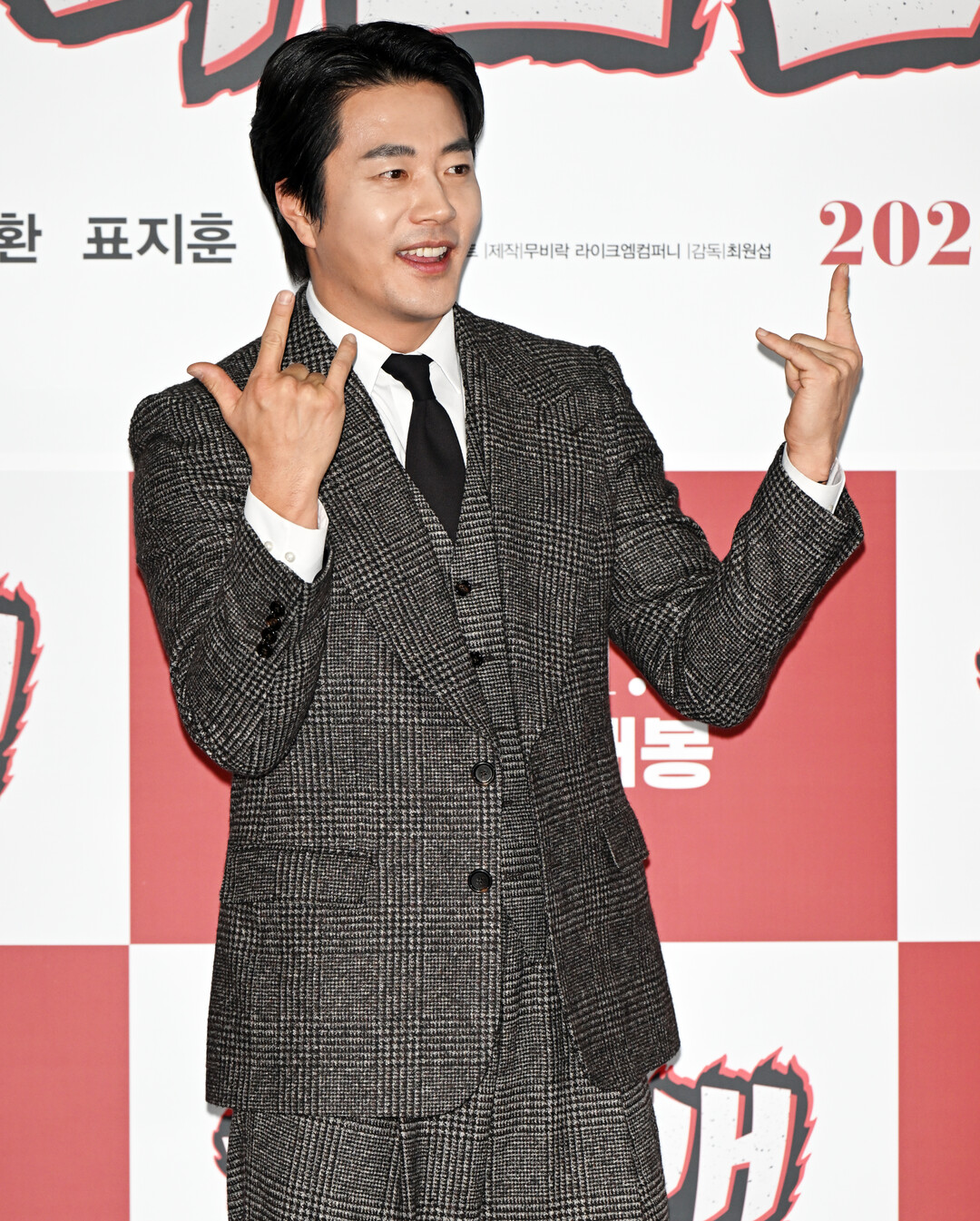 권상우는 이날 그레이와 블랙이 조화를 이룬 글렌 체크 패턴의 더블 브레스트 수트를 선택했다. 견고한 어깨 라인과 넓은 라펠이 특징인 재킷은 클래식한 남성미를 강조하며, 투 버튼 스타일로 정통 테일러링의 품격을 드러냈다.