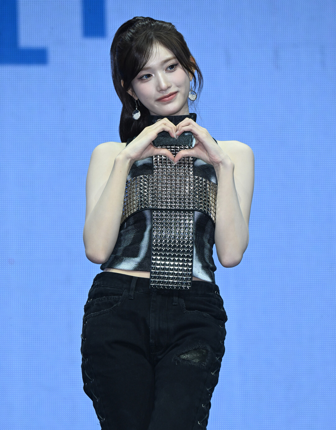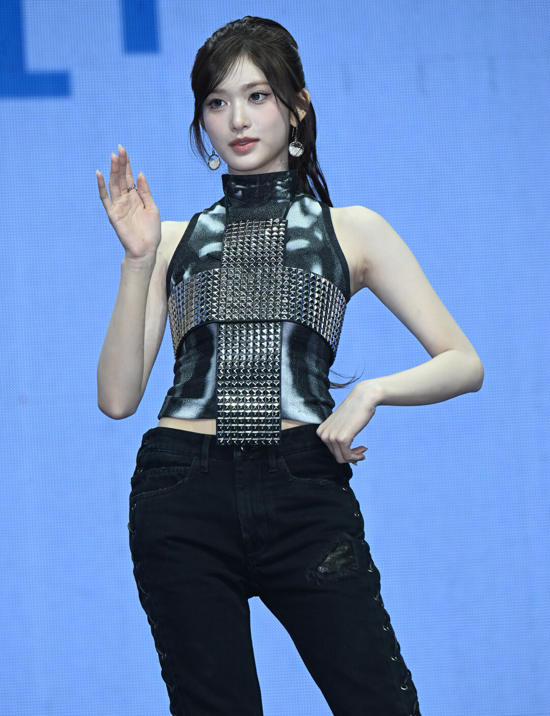주얼리는 원형 플랫 디스크 형태의 실버 드롭 이어링과 볼드한 실버 링으로 간결하게 구성됐다. 라일락 톤의 은은한 매니큐어는 올블랙과 실버로 이루어진 전체 스타일링 속에서 예상치 못한 부드러운 이탈을 만들어내며 이서만의 개성을 섬세하게 드러냈다. 앞머리를 내린 하프업 헤어는 볼륨감 있게 올린 위쪽과 자연스럽게 흘러내리는 웨이브 아래쪽이 어우러져 강인한 스타일링 속에서도 여성스러운 부드러움을 잃지 않았다. 블루 계열을 강조한 아이 메이크업이 이서의 맑고 깨끗한 눈매를 한층 또렷하게 부각시켰으며, 하트 제스처와 한 손 들기 등 팬들을 향한 사랑스러운 포즈가 강렬한 스타일링과 이루는 온도 차는 이서만의 매력적인 이중성을 극적으로 드러냈다.