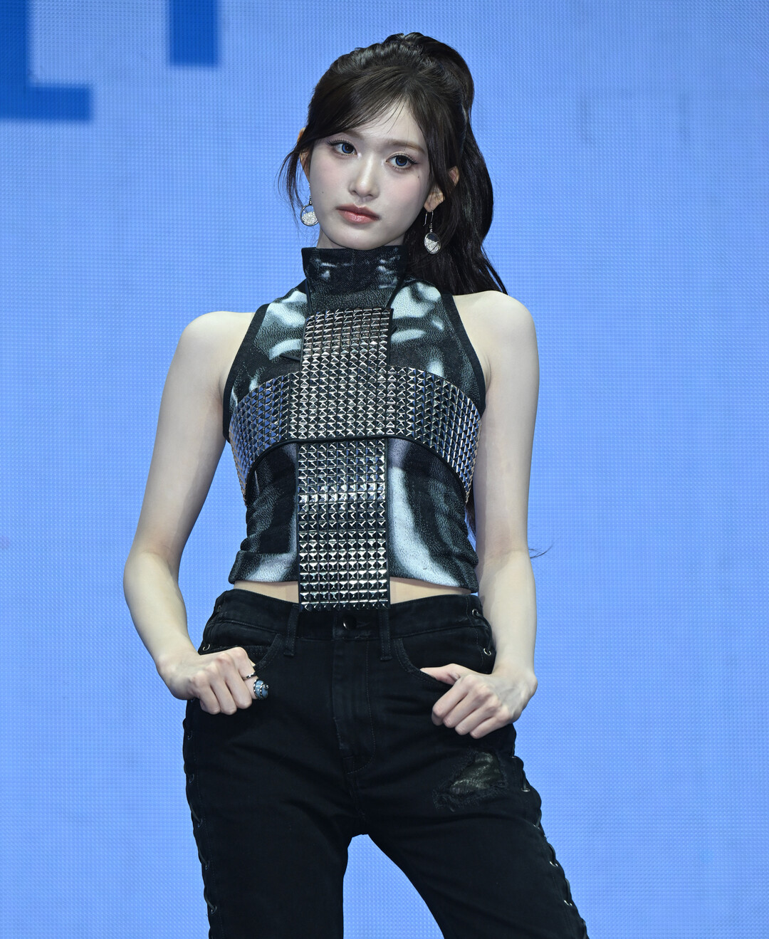 상의는 블랙과 그레이의 추상적 모노크롬 그래픽 패턴이 인쇄된 터틀넥 홀터넥 크롭 탑으로, 이번 룩의 핵심 아이템이었다. 번지고 녹아드는 듯한 패턴이 아날로그 필름 노출이나 수면 위의 반사광을 연상시키며 몽환적이면서도 차가운 분위기를 만들어냈다. 상의 전면에는 피라미드 형태의 실버 금속 스터드가 격자 구조로 촘촘하게 배열되어, 가슴에서 허리까지 이어지는 수직 라인이 몸의 중심축을 강하게 잡아줬다. 소매 없이 어깨와 팔을 완전히 드러내는 홀터넥 구조는 이서의 가녀린 실루엣과 극명한 대비를 이루며 강렬함 속에서 섬세함을 동시에 드러냈고, 크롭 기장이 허리 라인을 자연스럽게 노출시키며 현대적인 섹시함을 더했다.