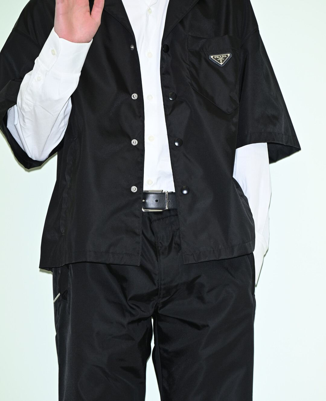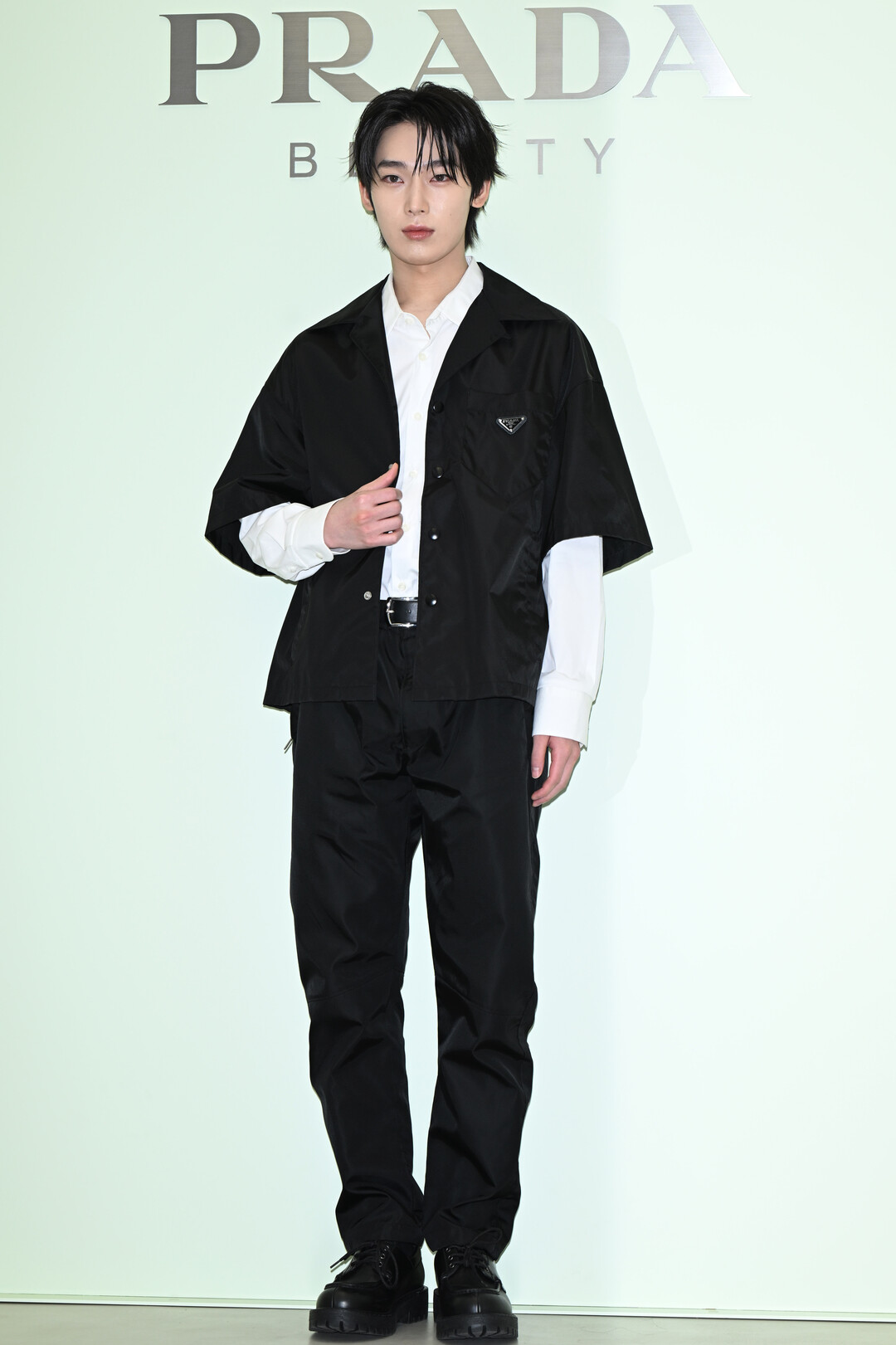 이날 선우의 룩을 완성한 핵심 아이템은 프라다 특유의 나일론 소재로 제작된 블랙 반소매 셔츠 재킷이었다. 가슴 포켓 위에 프라다의 상징인 삼각형 금속 로고 플레이크가 또렷하게 부착되어 브랜드 아이덴티티를 명확히 드러냈고, 스냅 버튼으로 여밈을 구성해 스트리트적인 감각을 더했다.