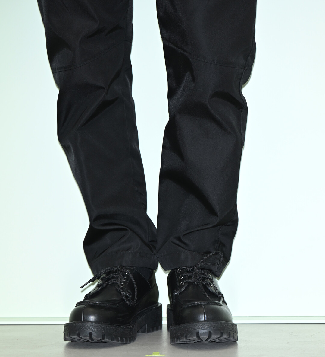 슈즈는 두꺼운 러그솔이 특징적인 블랙 레이스업 옥스퍼드를 선택해 전체 룩의 무게감과 일관성을 유지했다. 묵직한 밑창이 달린 블랙 슈즈는 나일론 팬츠의 볼륨감과 조화를 이루며 강인하면서도 세련된 인상을 완성했다. 머리부터 발끝까지 한 치의 흐트러짐 없이 블랙으로 통일된 스타일은 남성 럭셔리 패션의 정수를 보여주었다는 호평을 받았다.