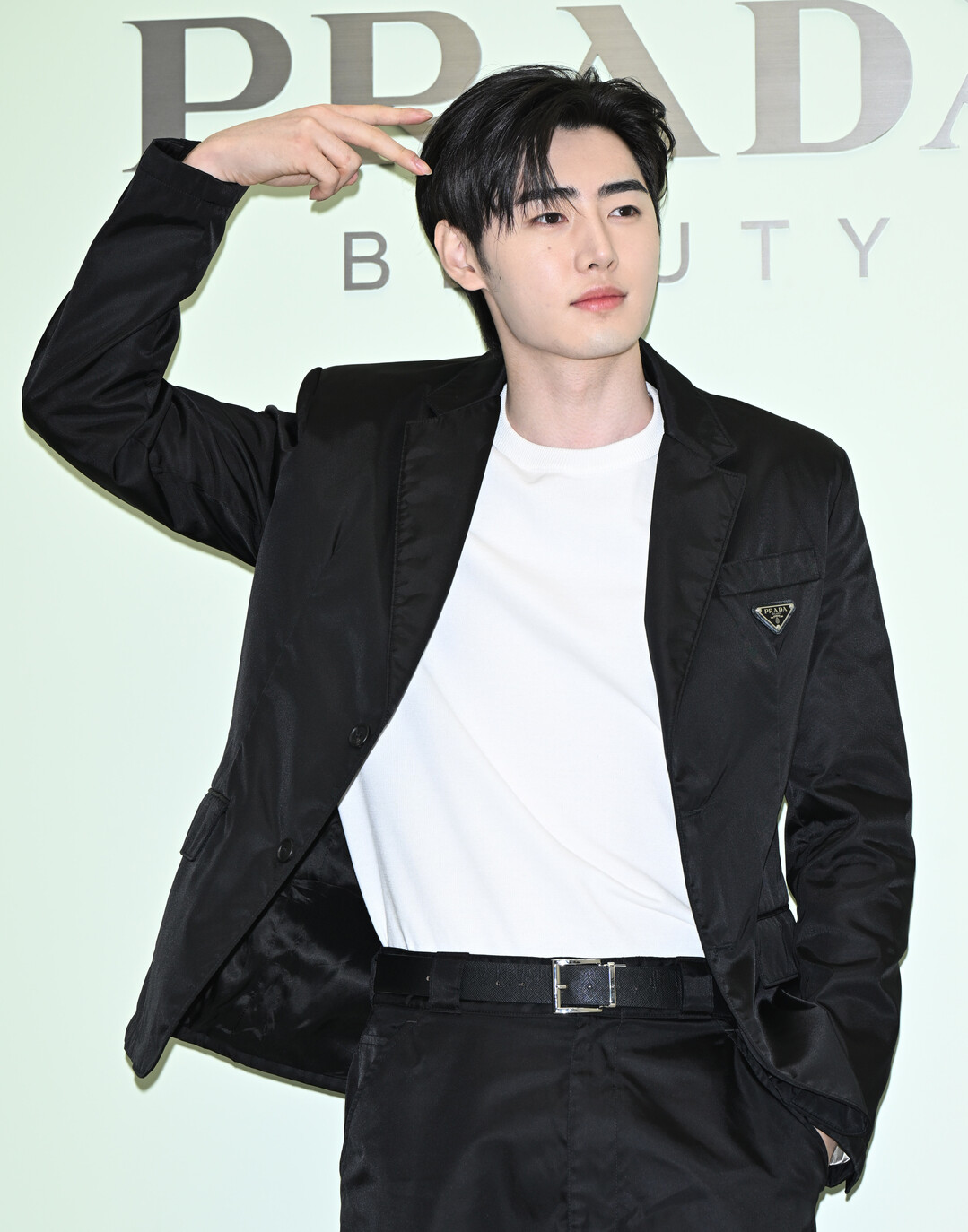 이날 성훈의 스타일링 핵심은 프라다 시그니처 나일론 소재로 제작된 블랙 테일러드 재킷이었다. 일반적인 수트 재킷의 구조적인 실루엣을 기반으로 하되, 광택감 있는 나일론 원단을 사용해 스포티하면서도 럭셔리한 무드를 동시에 연출한 것이 특징이다. 왼쪽 가슴 포켓 위에 자리한 프라다 삼각형 금속 로고 플레이크는 브랜드 헤리티지를 가장 직관적으로 드러내는 포인트로, 사진이 찍힐 때마다 존재감을 발휘했다.