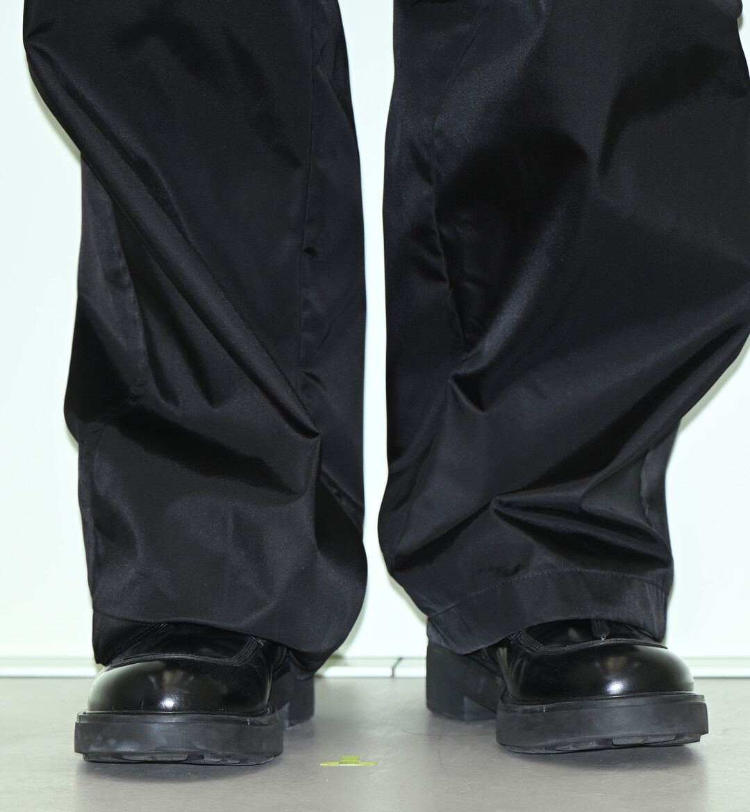 하의로는 블랙 나일론 카고 팬츠를 선택했다. 양 옆으로 넉넉하게 배치된 카고 포켓이 밀리터리 감성을 더하는 동시에 풍성한 볼륨감을 만들어냈고, 광택감 있는 소재가 재킷과의 통일성을 자연스럽게 완성했다. 팬츠 기장은 발등을 덮을 만큼 넉넉하게 처리되어 여유로우면서도 스타일리시한 실루엣을 연출했다.