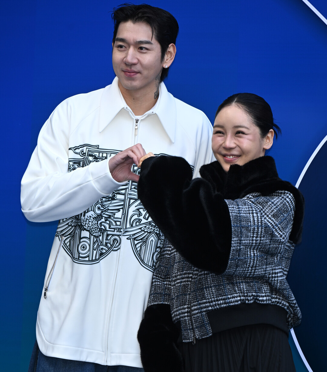이날 포토월 앞에 선 두 사람은 손을 맞잡아 하트를 만들며 신혼의 달콤함을 과시했다. 카메라를 향해 활짝 웃는 모습에서 행복감이 그대로 전해졌고, 자연스럽게 서로를 바라보며 미소 짓는 장면은 보는 이들까지 미소 짓게 만들었다.