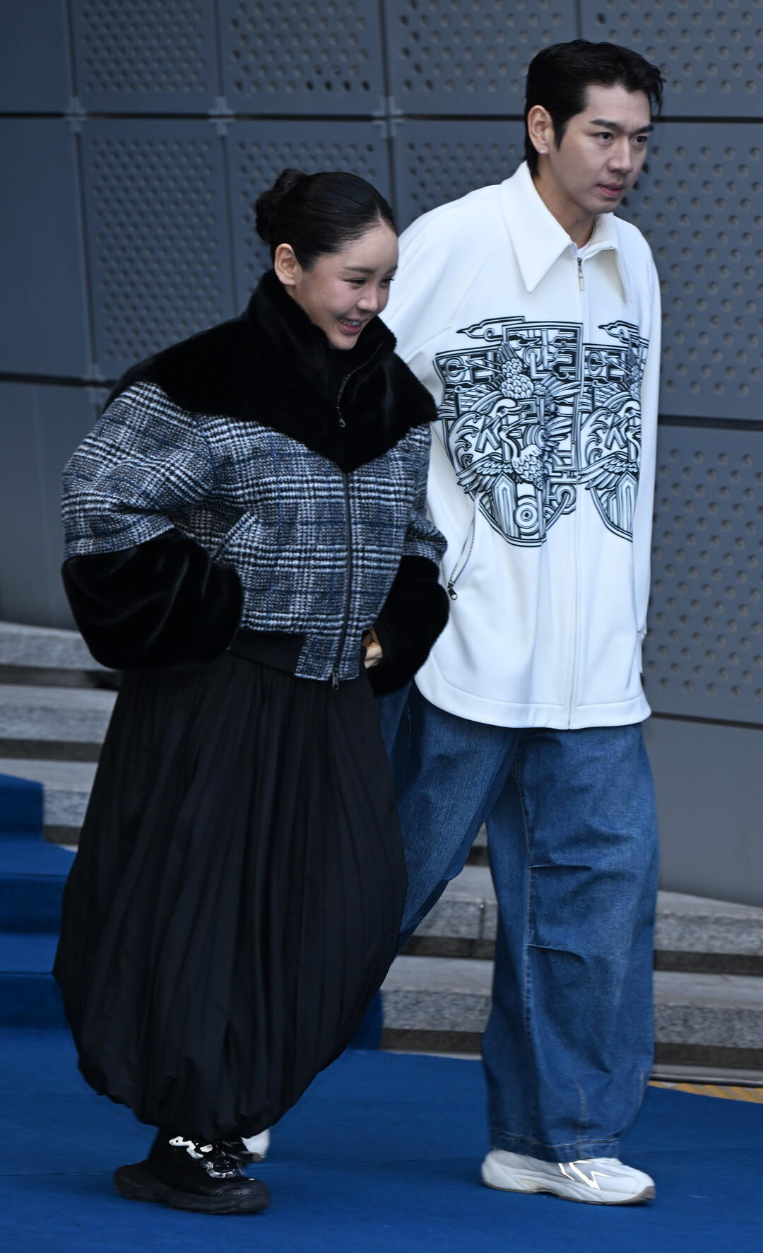 트루디는 블랙 컬러를 베이스로 한 우아한 룩으로 시선을 사로잡았다. 블랙 퍼 디테일이 돋보이는 재킷과 체크 패턴 베스트를 레이어드해 입어 클래식하면서도 모던한 분위기를 자아냈다. 하의로는 플리츠 롱스커트를 선택해 여성스러운 우아함을 더했고, 블랙 스니커즈로 전체적인 통일감을 주었다.