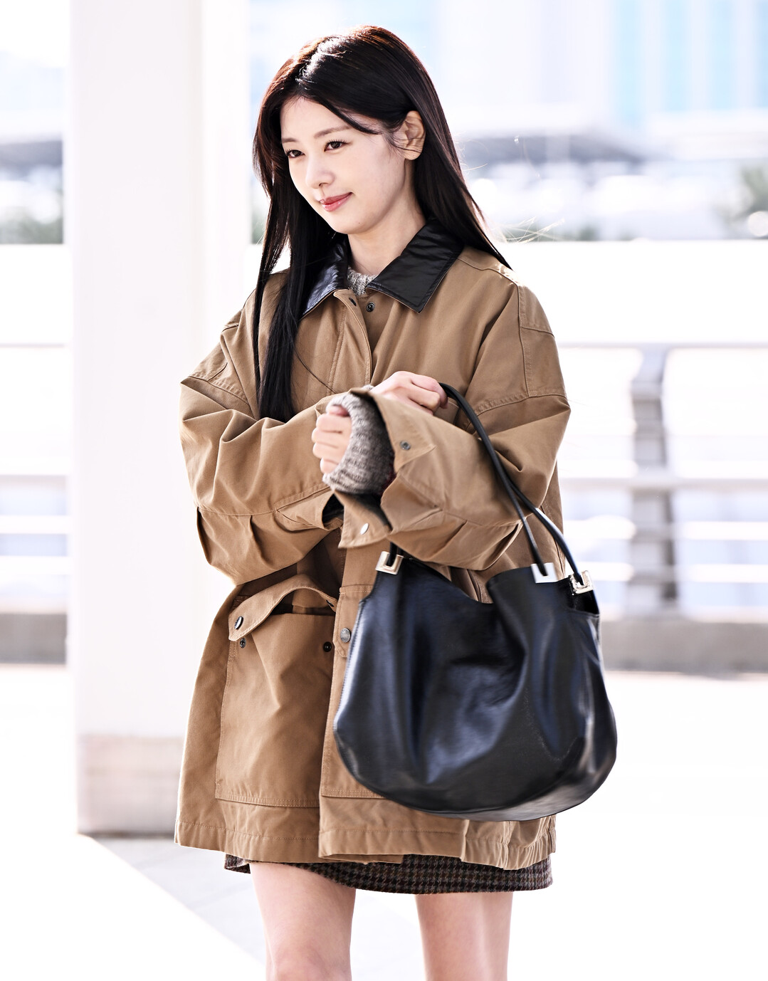 검은색 가죽 호보백은 캐주얼함 속에서도 세련미를 잃지 않게 하는 키 아이템이었다. 부드러운 가죽 소재의 호보백은 공항 패션에 자주 등장하는 아이템이지만, 정소민은 재킷의 베이지 톤과 절묘한 대비를 이루며 시크한 느낌을 완성했다. 넉넉한 사이즈의 백은 장거리 여행에 필요한 물품을 충분히 수납할 수 있는 실용성까지 갖췄다.