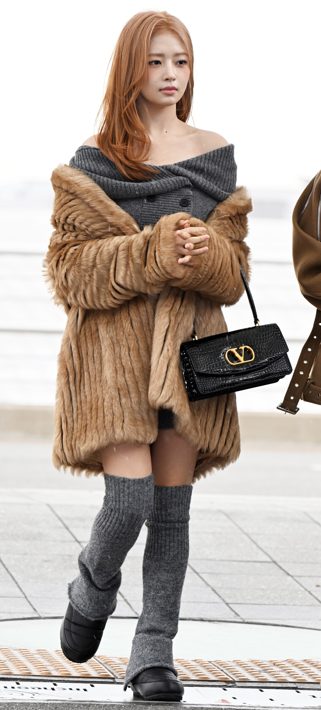 레이는 블랙 크로코 패턴의 발렌티노 숄더백을 선택했다. 골드 V 로고가 돋보이는 이 백은 럭셔리한 포인트를 더하며, 오렌지 톤의 긴 생머리와 조화를 이뤘다. 화사한 오렌지 헤어 컬러는 레이의 시그니처 스타일로, 전체적으로 따뜻한 겨울 무드를 완성했다.