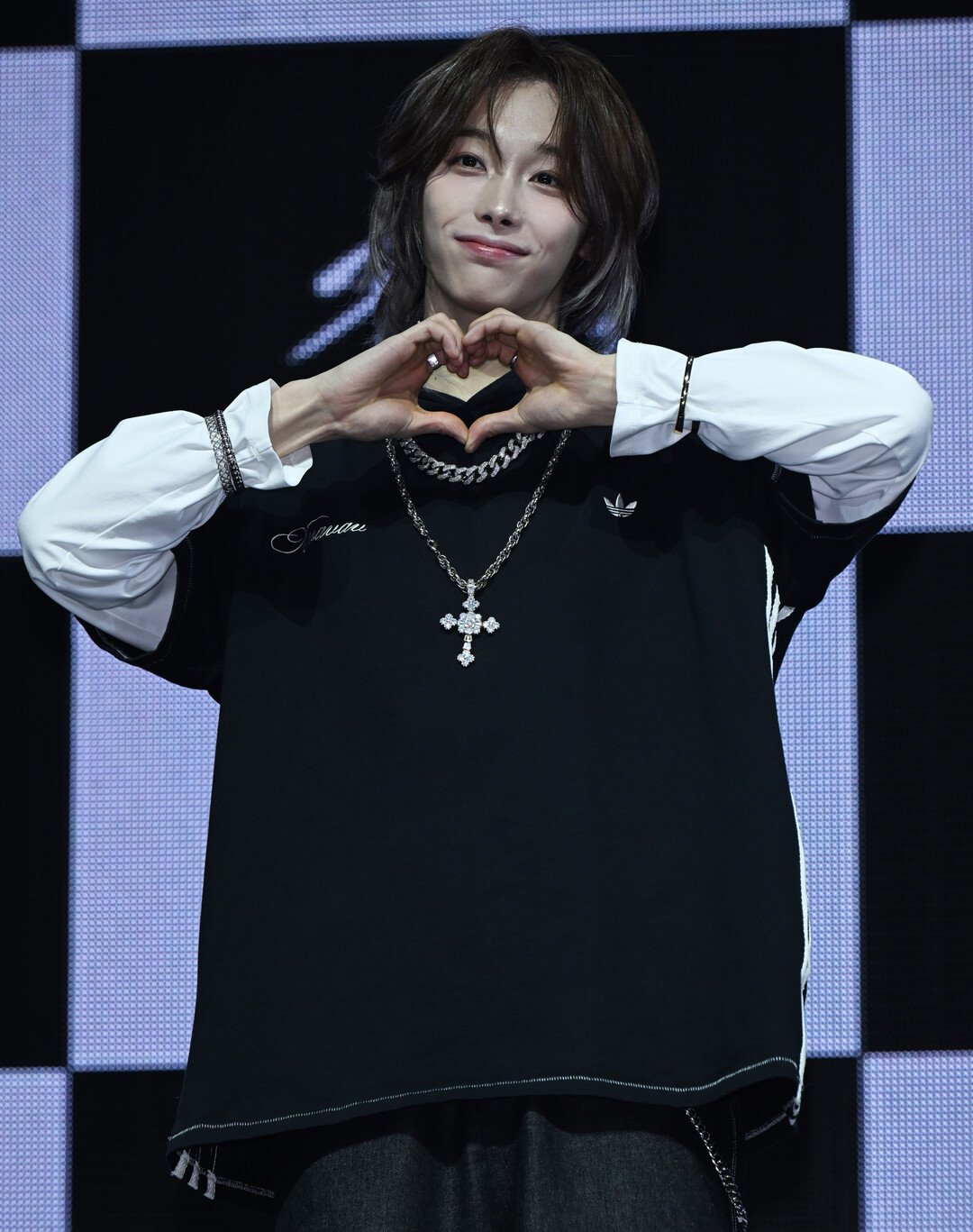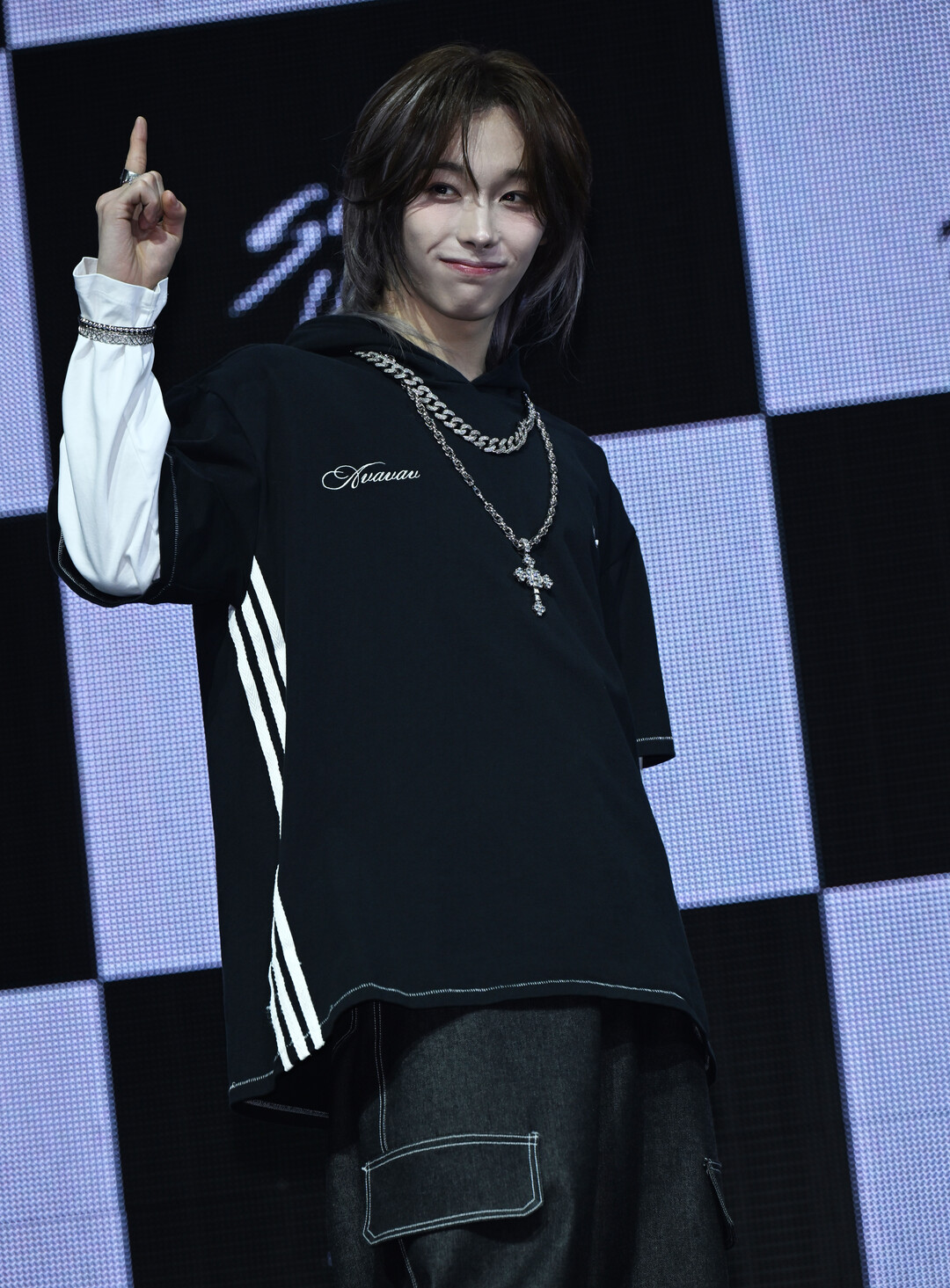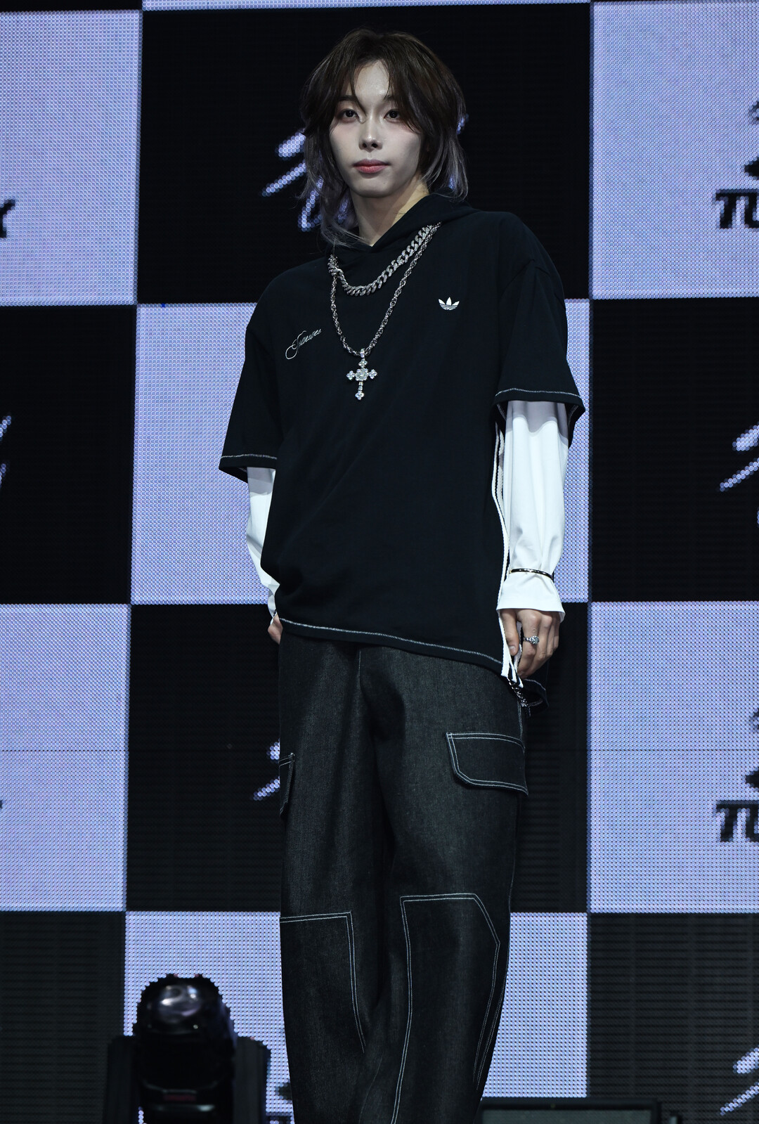 이날 타이라 스타일링에서 가장 강렬한 존재감을 발휘한 것은 단연 주얼리 레이어링이었다. 굵직한 실버 쿠반 링크 체인 네크리스를 짧게 착용하고, 그 아래로 스타 큐빅이 세팅된 대형 크로스 팬던트 네크리스를 길게 레이어드하는 투 체인 스타일링이 캐주얼한 블랙 후디 위에서 럭셔리하고 강렬한 힙합 무드를 만들어냈다. 정교하게 큐빅이 세팅된 크로스 팬던트의 반짝이는 광택이 무대 조명 아래서 더욱 빛을 발하며 시선을 집중시켰다.
