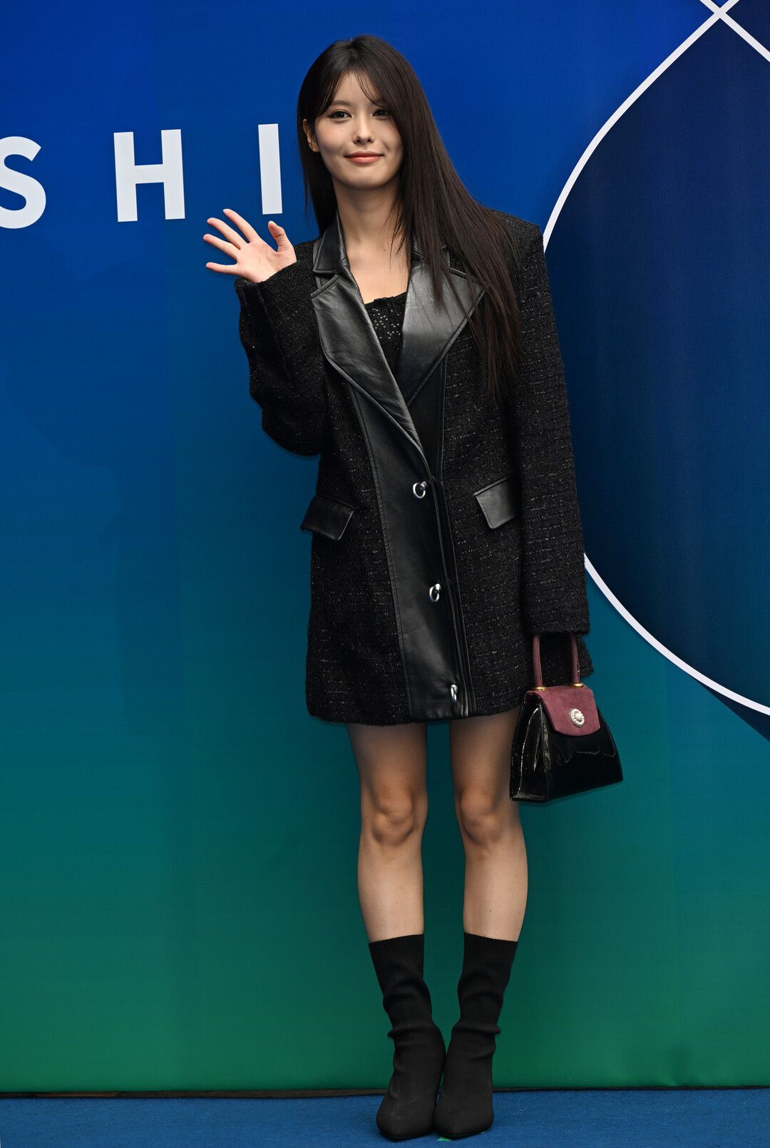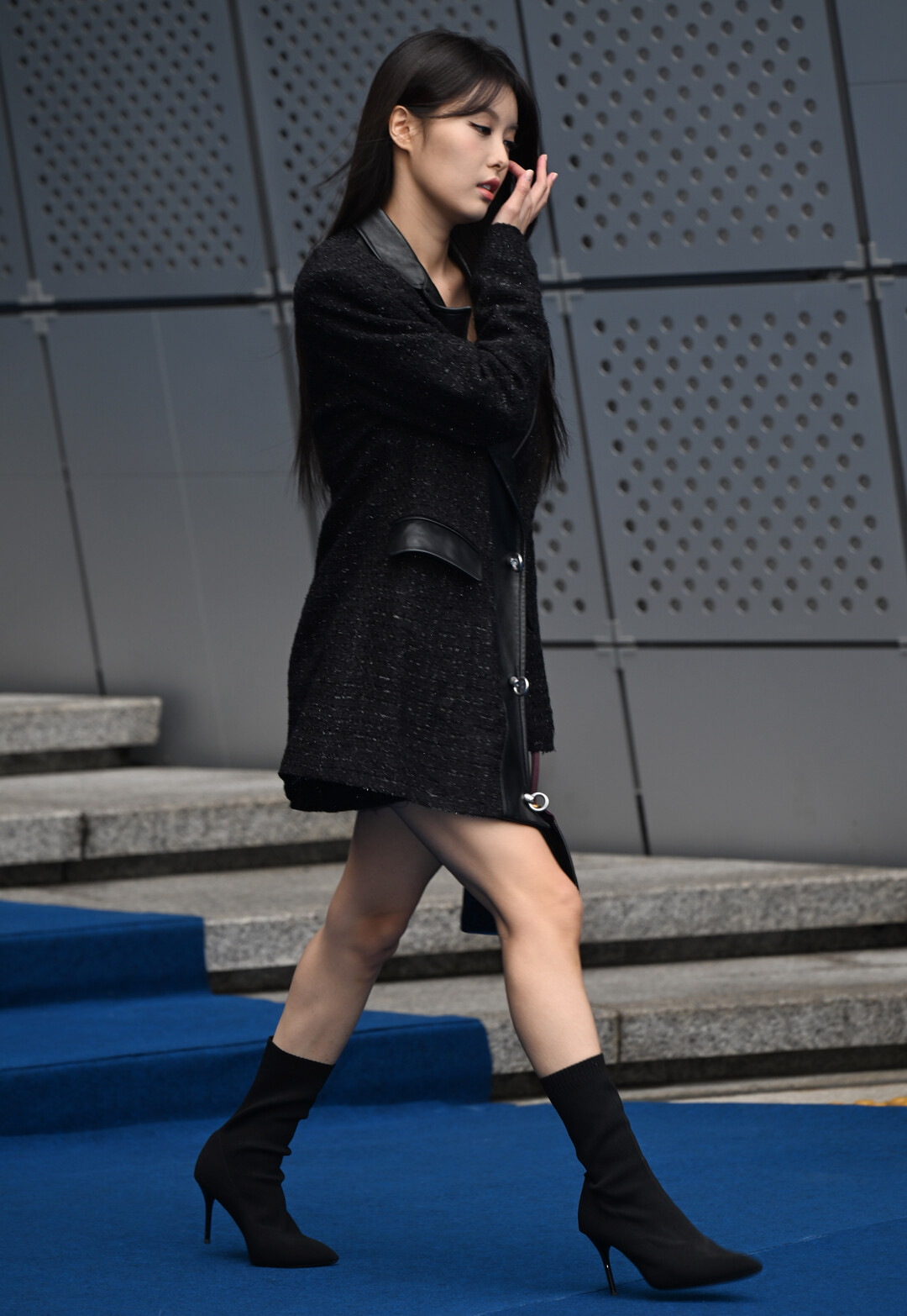 재킷 안에는 블랙 시퀸 디테일이 장식된 톱을 레이어링해 화려함을 절제 있게 표현했다. 미니 렝스의 재킷 드레스는 아인의 긴 다리 라인을 강조하며, 블랙 삭스 부츠로 마무리한 발끝까지의 올블랙 코디는 통일감과 세련미를 동시에 살렸다.