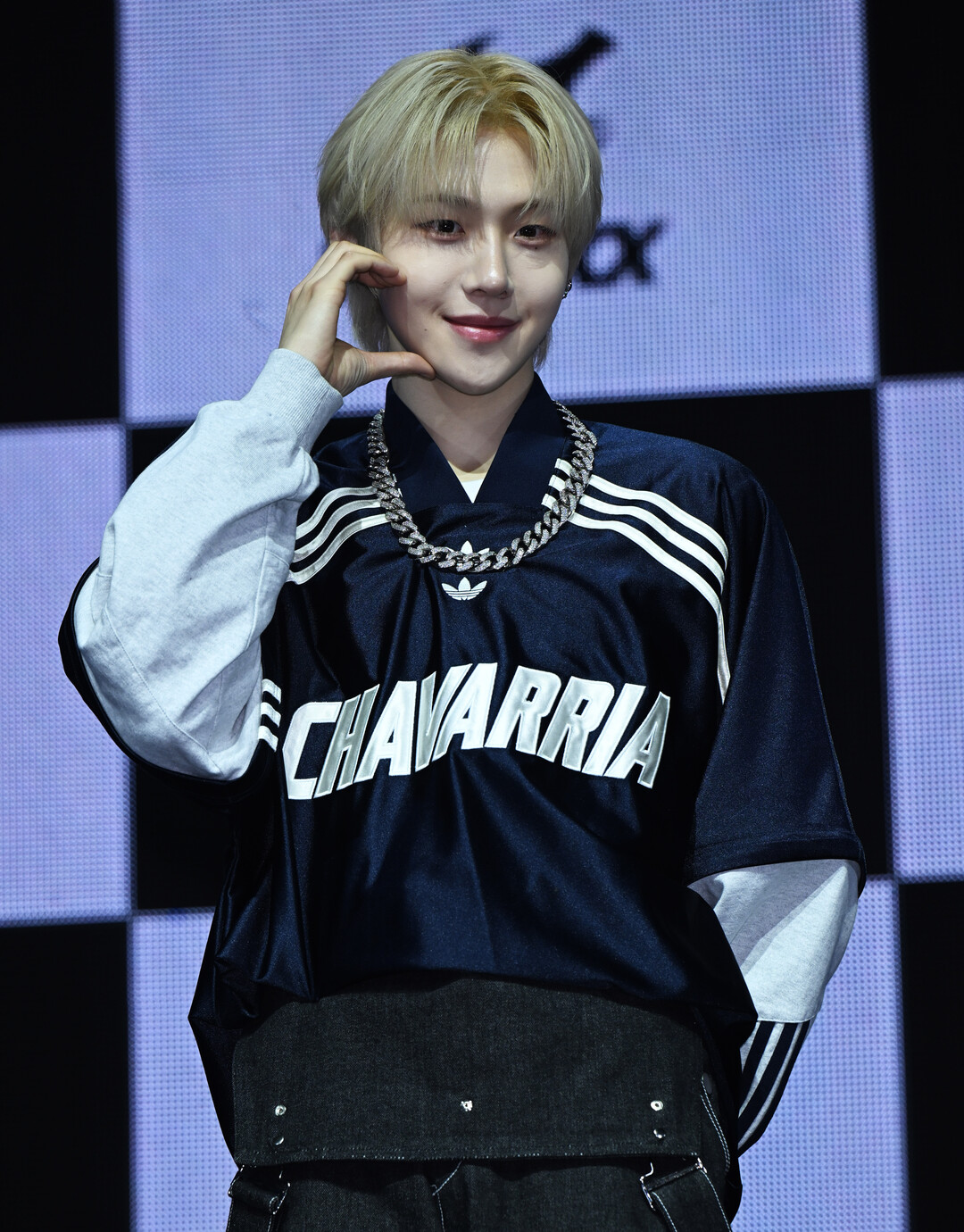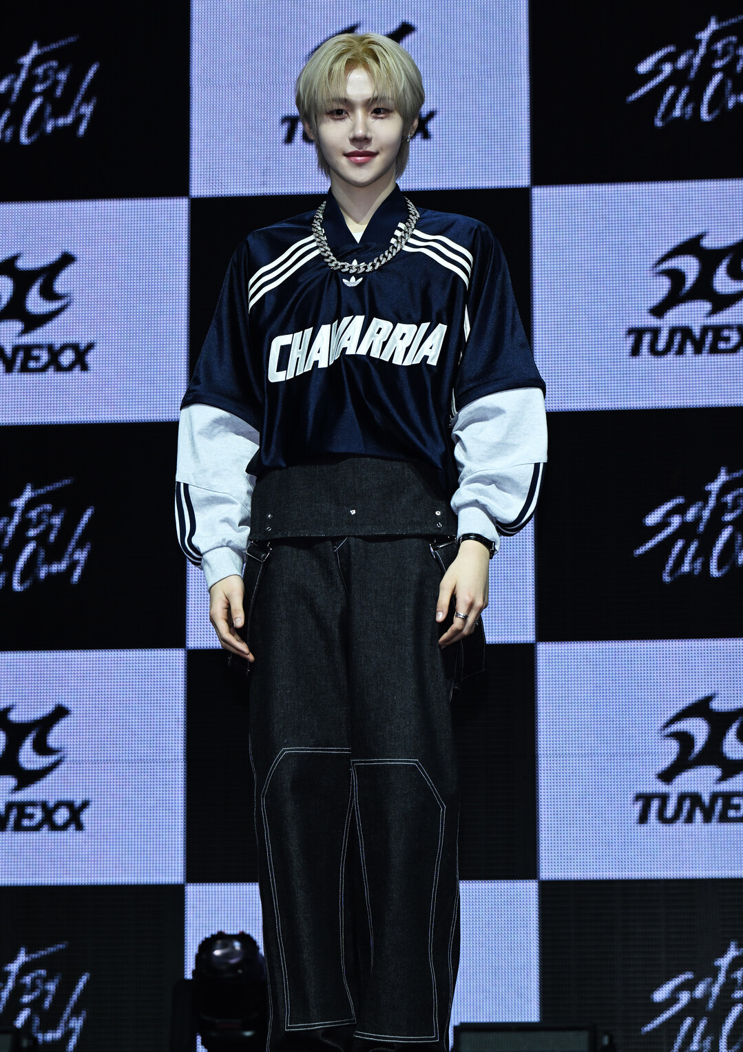 이날 시환 스타일링의 핵심은 아디다스(Adidas) X 차바리아(Chavarria) 콜라보레이션 네이비 풋볼 저지였다. 아디다스의 상징적인 쓰리 스트라이프 라인이 어깨와 소매를 따라 굵직하게 흘러내리고, 가슴 정중앙에는 아디다스 트레포일 로고와 함께 'CHAVARRIA'라는 선수 이름의 레터링이 대담하게 프린트된 이 저지는 스포츠웨어와 하이패션의 경계를 넘나드는 콜라보레이션 아이템이다.