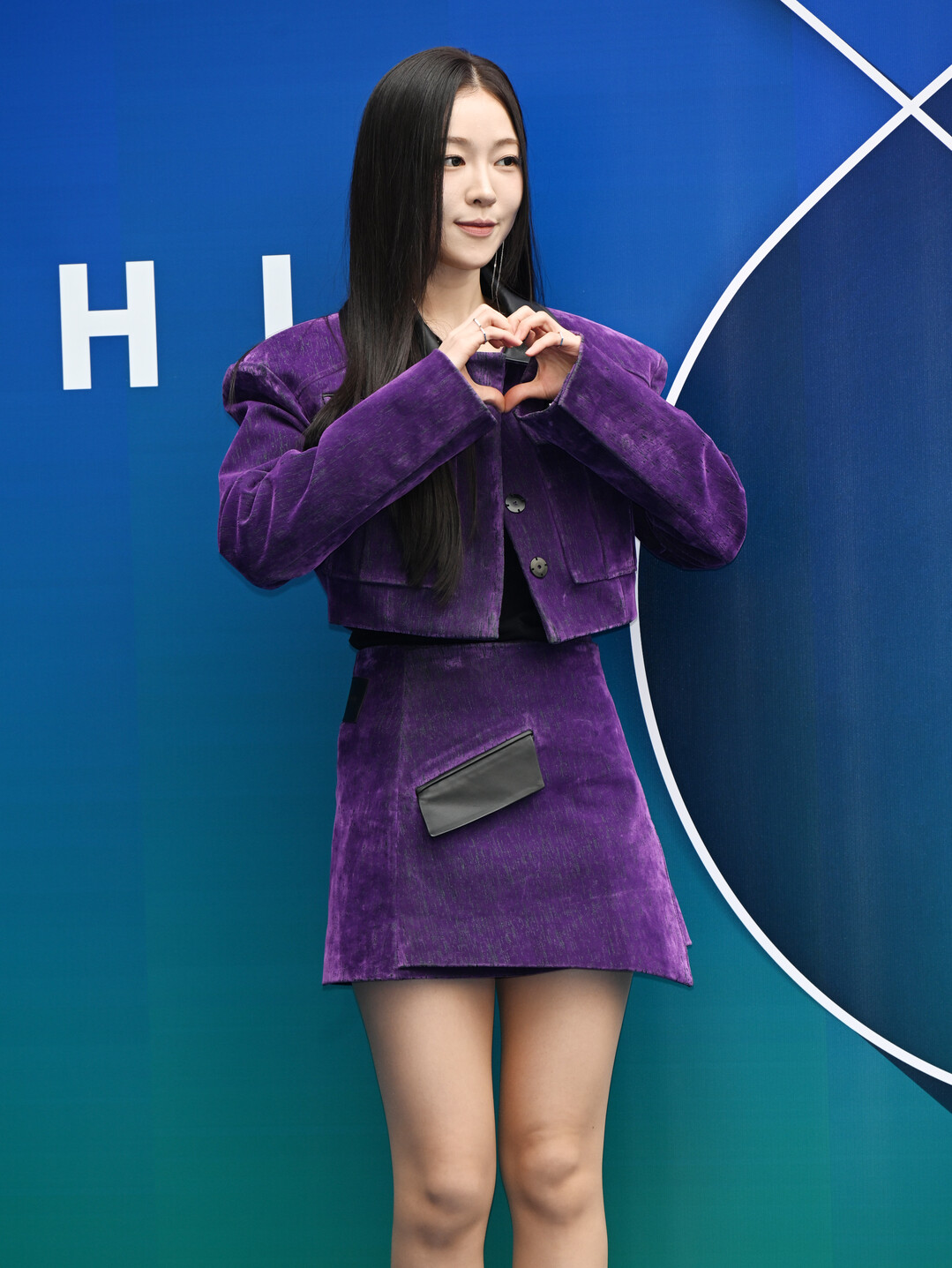 송지우가 선택한 의상은 깊은 퍼플 컬러의 벨벳 소재 투피스였다. 크롭 길이의 재킷은 블랙 레더 칼라와 플랩 포켓 디테일로 밀리터리 감성을 더했다. 가슴 위치의 두 개 포켓과 허리 양옆의 포켓이 대칭을 이루며 구조적 균형감을 완성했다. 3개의 블랙 버튼이 중앙에 배치되어 시각적 포인트를 제공했다.