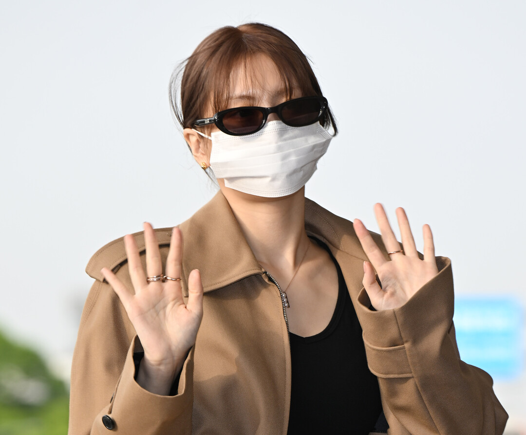 액세서리 선택도 돋보였다. 다크 브라운 렌즈의 슬림 직사각 선글라스를 착용해 도회적이고 쿨한 분위기를 완성했으며, 양손에 실버 링을 레이어드해 절제된 포인트를 더했다. 귀에는 골드 이어링으로 화사함을 살렸다. 헤어는 브라운 컬러의 앞머리를 내린 하프업 스타일로 단정하게 정돈해 전체 코디의 세련미를 배가시켰다.