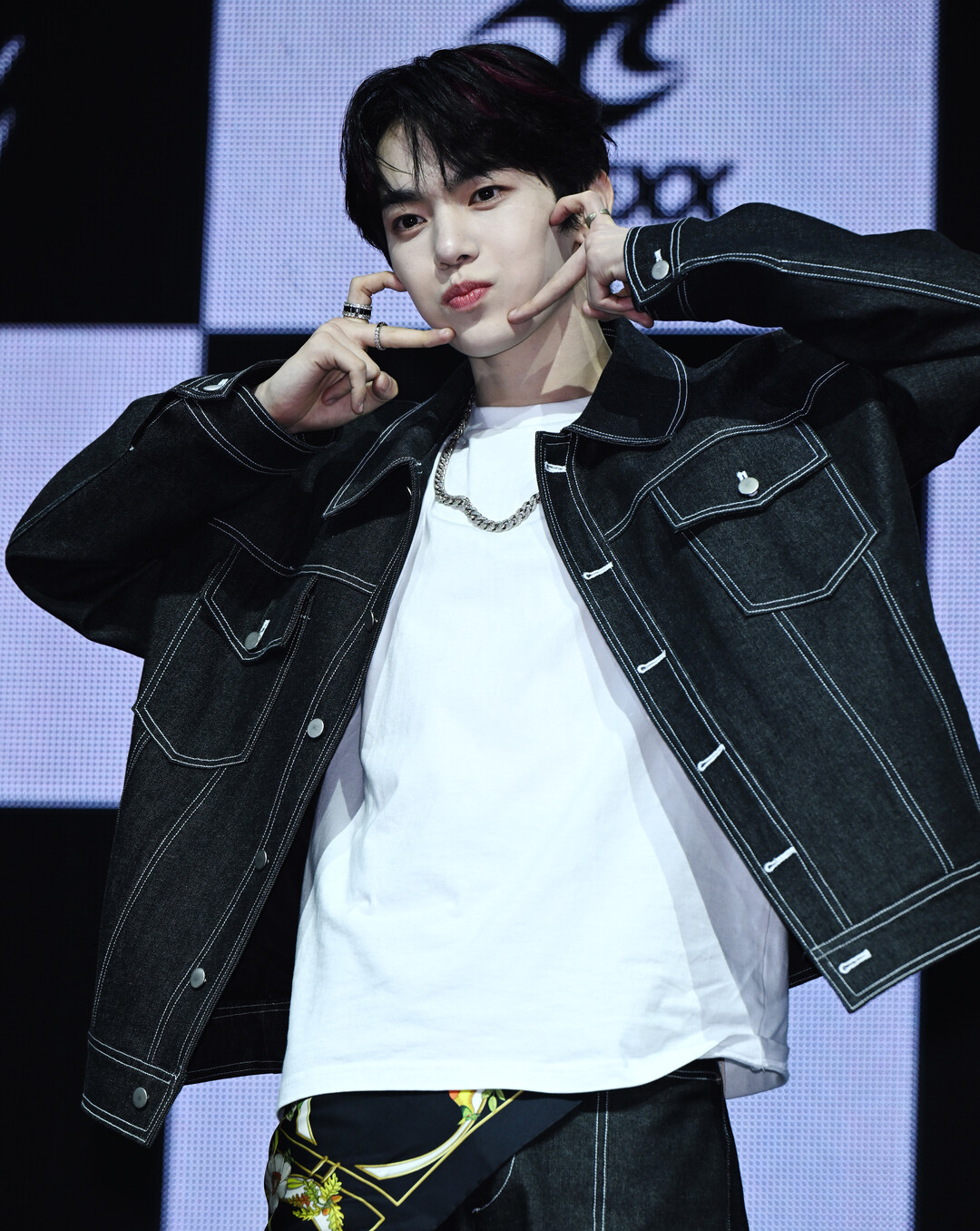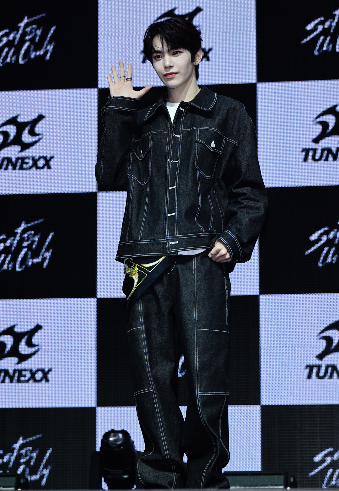 이날 동규 스타일링의 베이스는 블랙 오버사이즈 데님 재킷이었다. 재킷 전면에 촘촘하게 박음질된 화이트 스티치 라인이 짙은 블랙 바탕 위에서 선명한 대비를 만들어내며 재킷에 스트리트 무드와 구조적인 디테일을 동시에 부여했다. 양 가슴의 플랩 포켓, 소매와 옆선을 따라 이어지는 스티치 처리까지 빈틈없이 완성된 이 재킷은 다른 멤버들의 블랙 데님 아이템과 같은 라인으로, 그룹 전체의 스타일링 통일성을 유지하는 동시에 동규만의 착장 방식으로 개성을 표현했다.