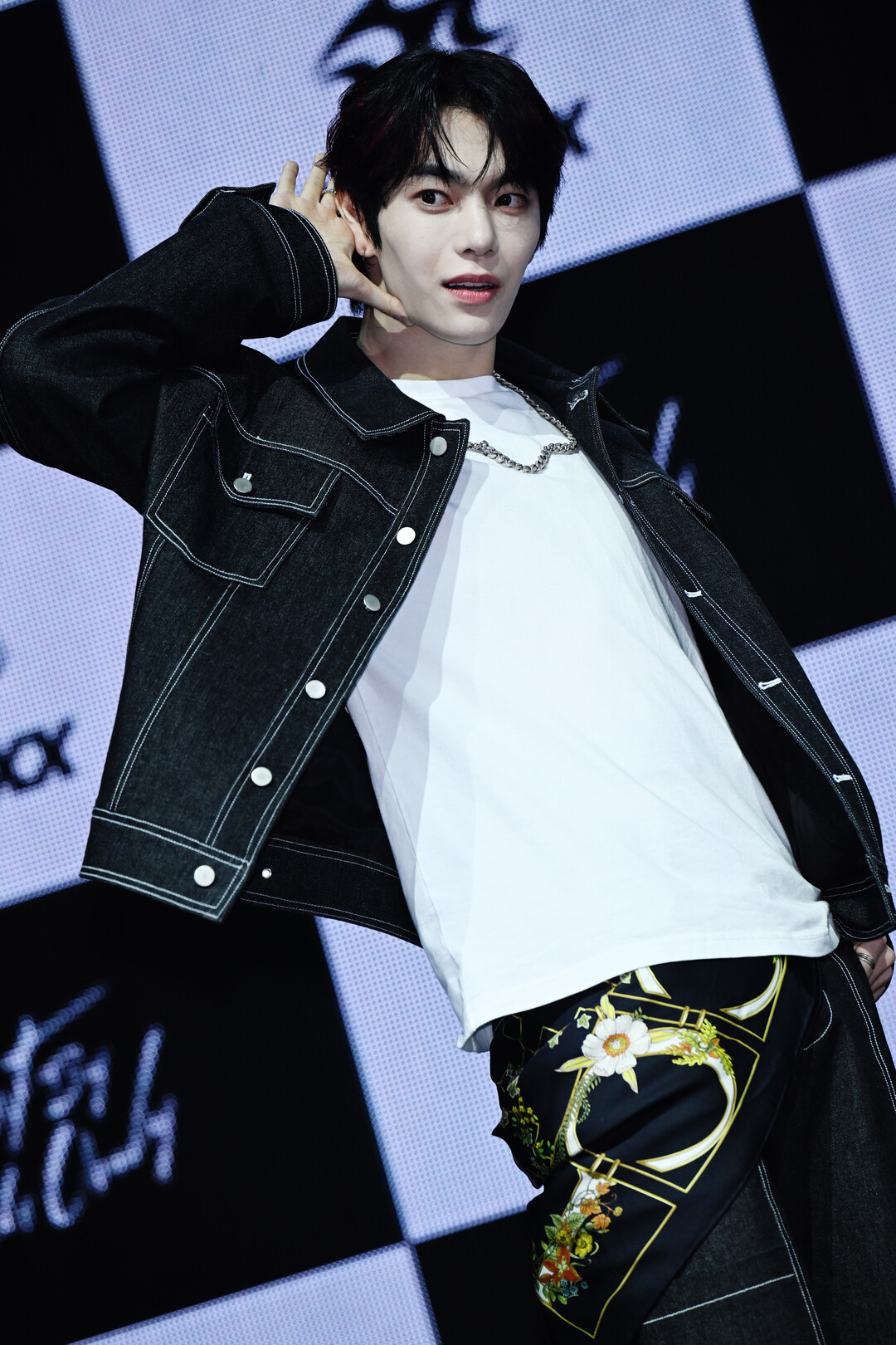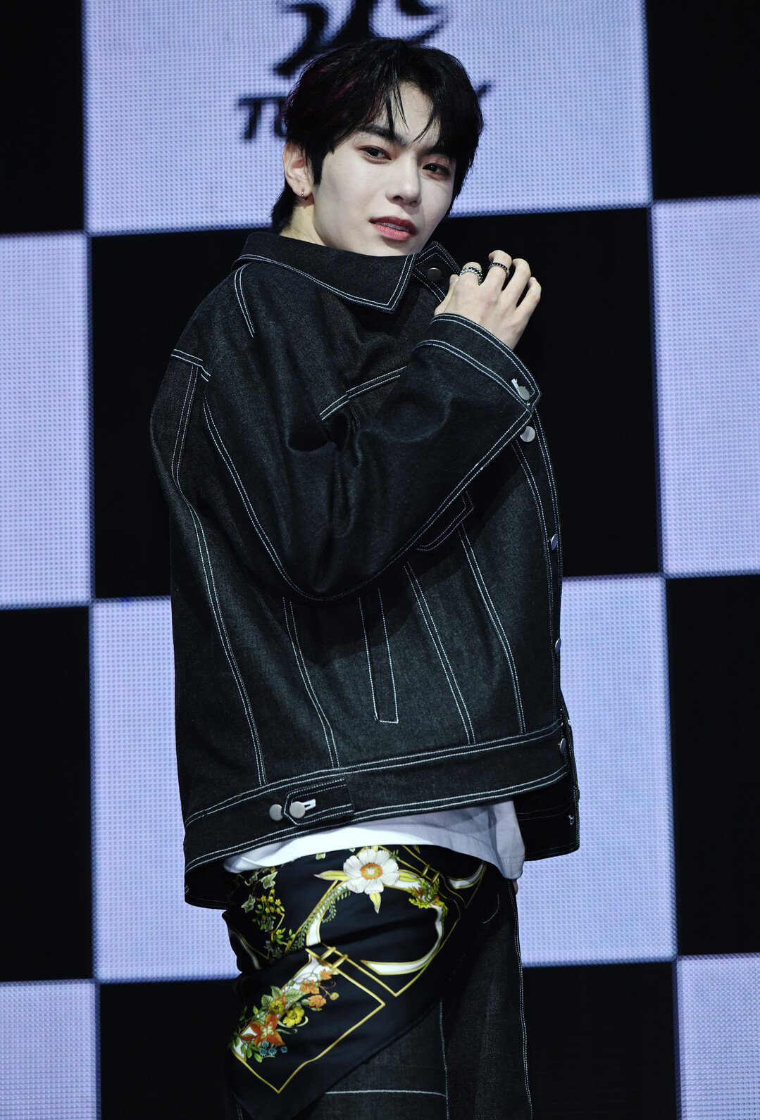 이날 동규 스타일링에서 가장 강렬한 화제를 모은 아이템은 데님에 걸친 플로럴 스카프였다. 짙은 블랙 바탕 위에 데이지, 국화 등 다양한 꽃 문양과 금색 기하학적 라인이 화려하게 수놓아진 이 스카프는 블랙 데님 재킷과 화이트 이너로 구성된 절제된 상의 스타일링과 극적인 대비를 이루며 전체 룩에 예상치 못한 화려함과 예술적 감성을 불어넣었다.