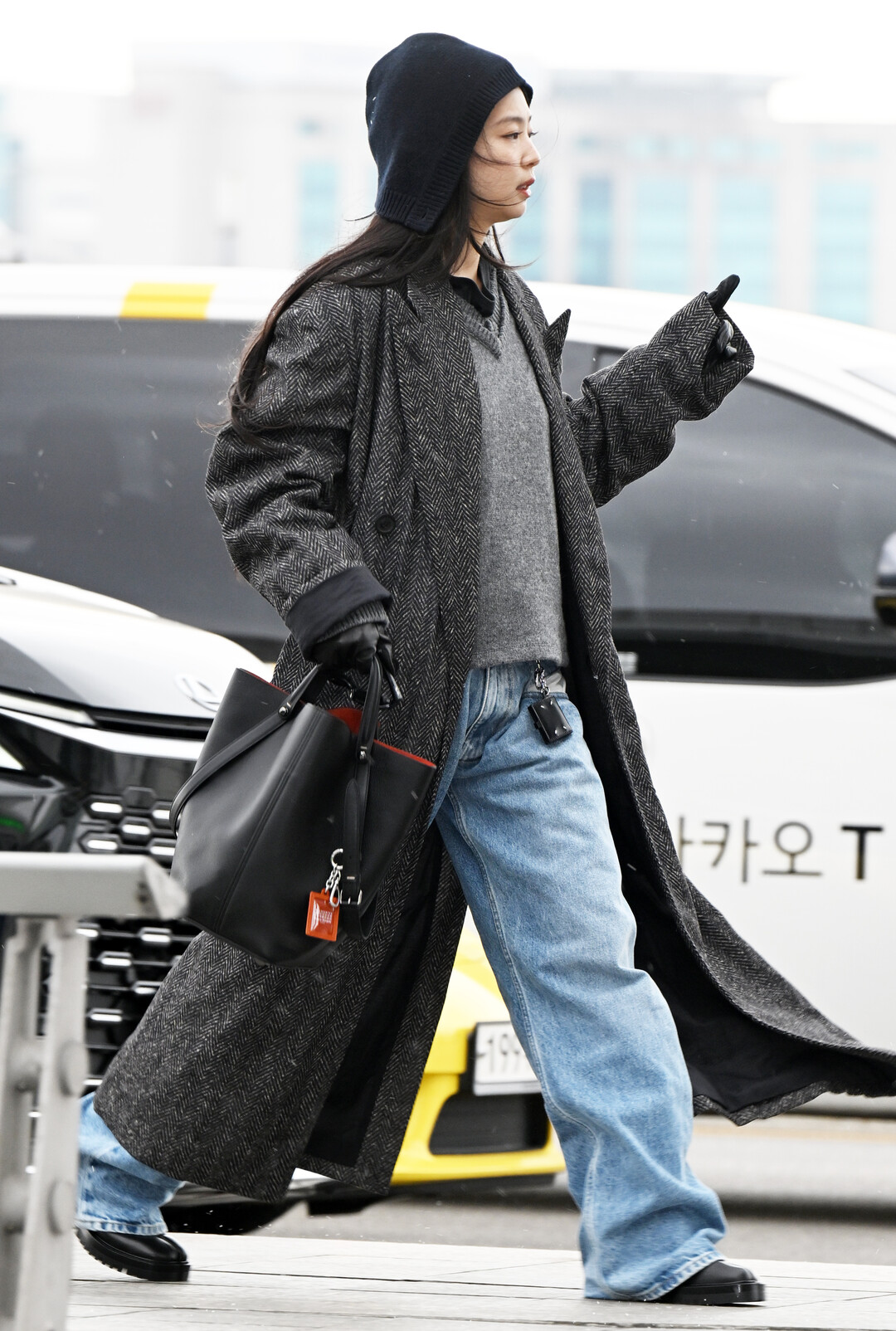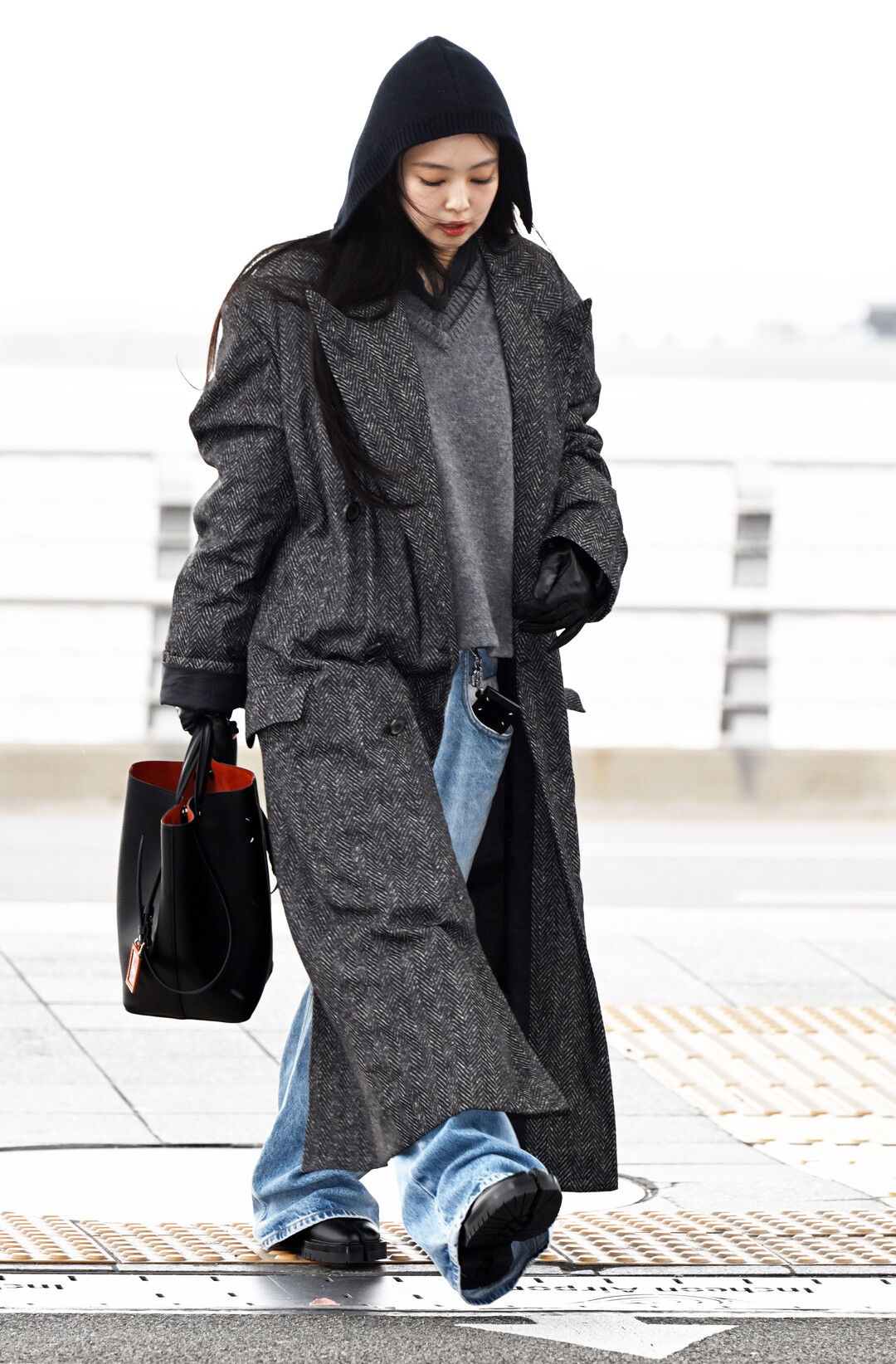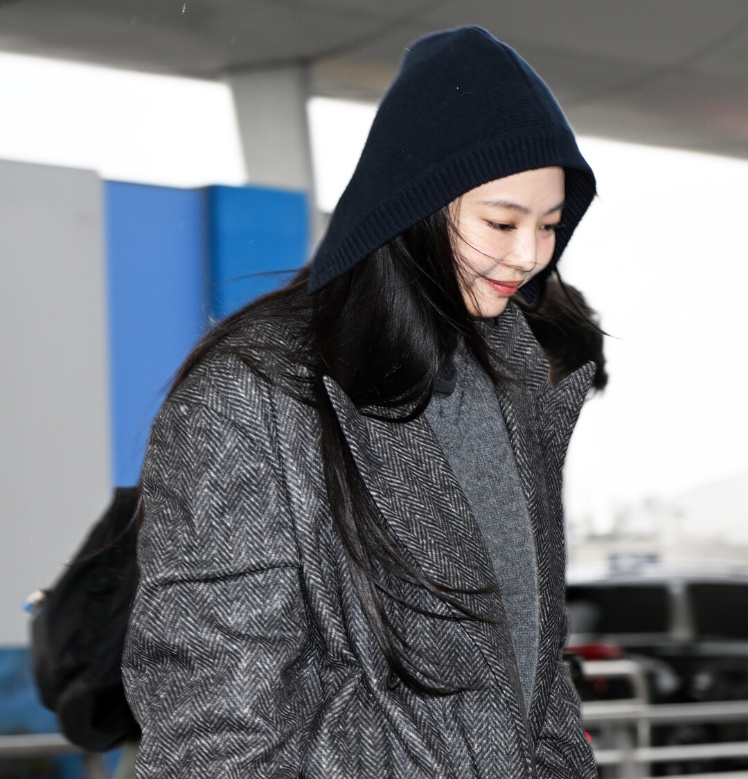 제니는 이날 헤링본 롱 코트와 데님의 조합으로 클래식한 우아함과 캐주얼한 편안함을 동시에 구현하며, 절제된 세련미가 돋보이는 공항 패션을 완성했다.