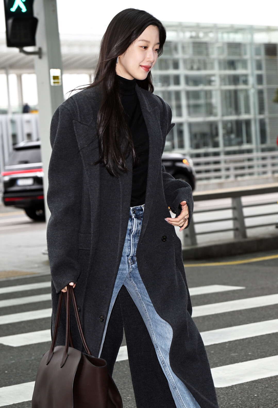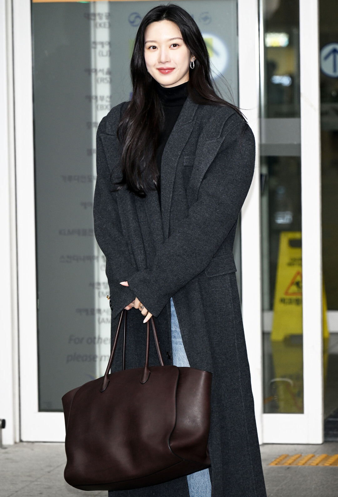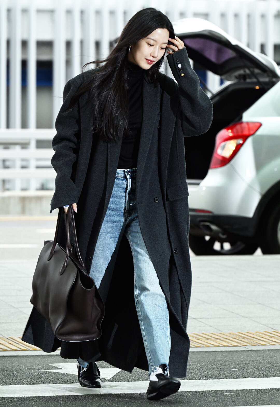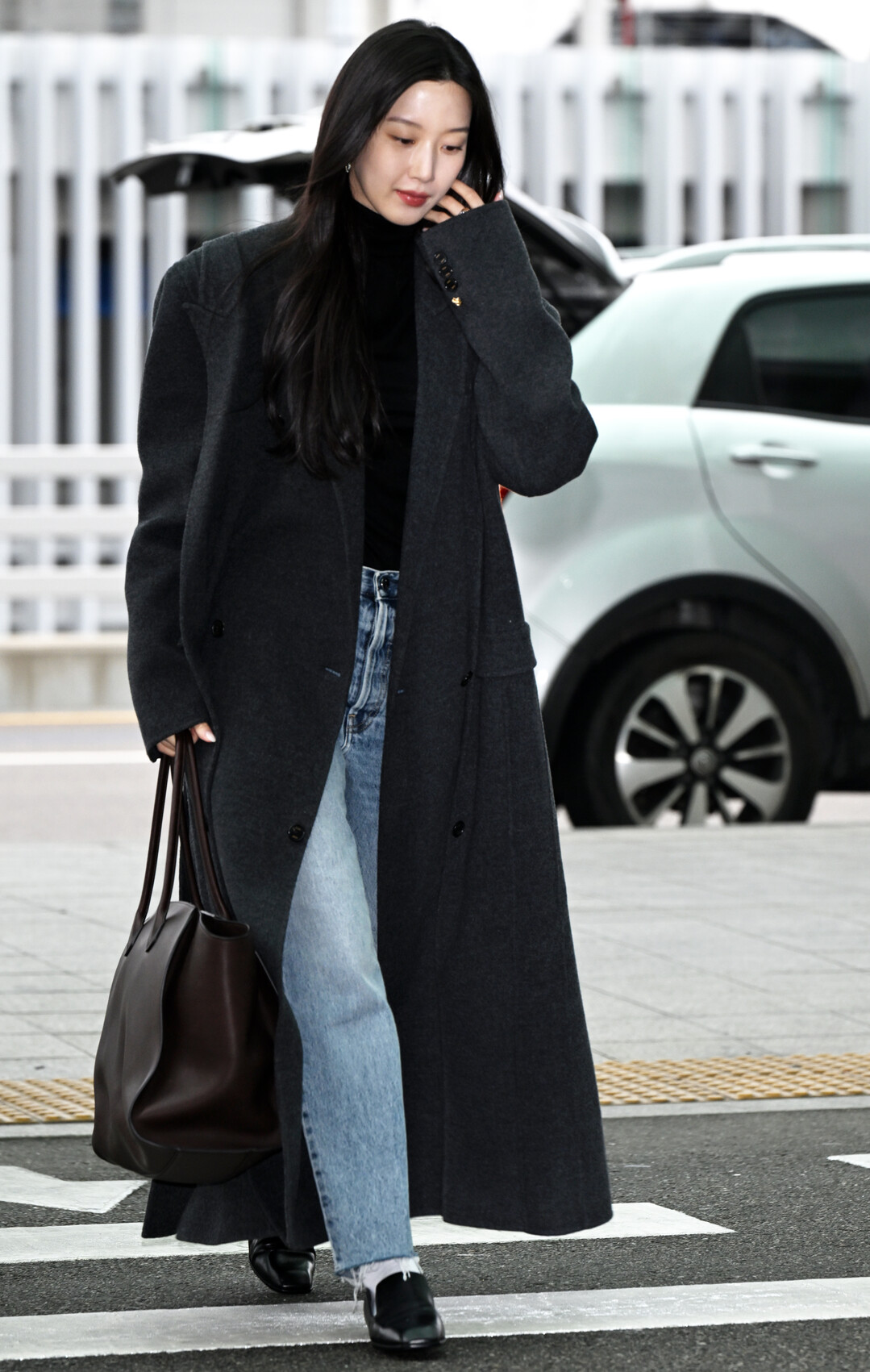 문가영은 이날 오버사이즈 롱 코트와 데님의 조합으로 절제된 시크함과 편안한 캐주얼을 동시에 구현하며, 미니멀한 세련미가 돋보이는 공항 패션을 완성했다.