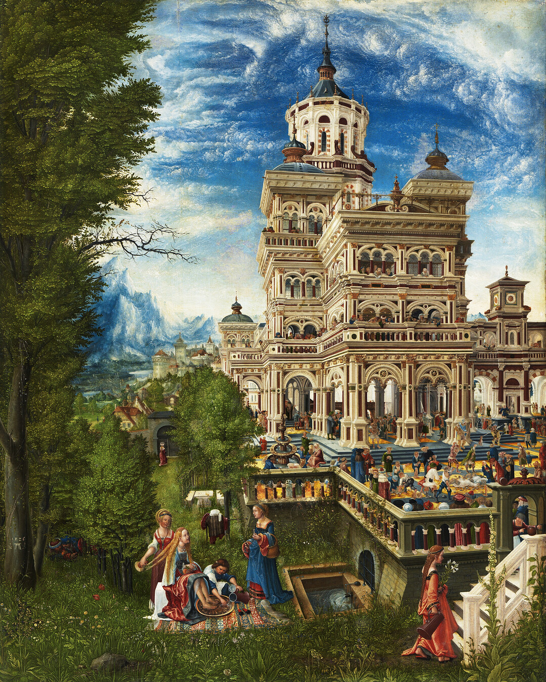 그러나 알트도르퍼의 해석은 동시대 어떤 화가와도 근본적으로 달랐다. 그는 수잔나의 위기 순간을 화면 전면에 클로즈업하는 대신, 화폭 하단 왼편 구석의 초록 풀밭에 조용하고 작게 배치했다. 화면의 압도적 공간은 온전히 거대한 환상적 궁전 건축과 광활한 자연에 할애된다. 오른편을 가득 채운 다층 원형 궁전은 고딕과 이탈리아 르네상스 양식이 혼합된 이상적 건축물로, 그 테라스와 계단, 광장에는 수십 명의 인물들이 분주히 살아 움직인다.