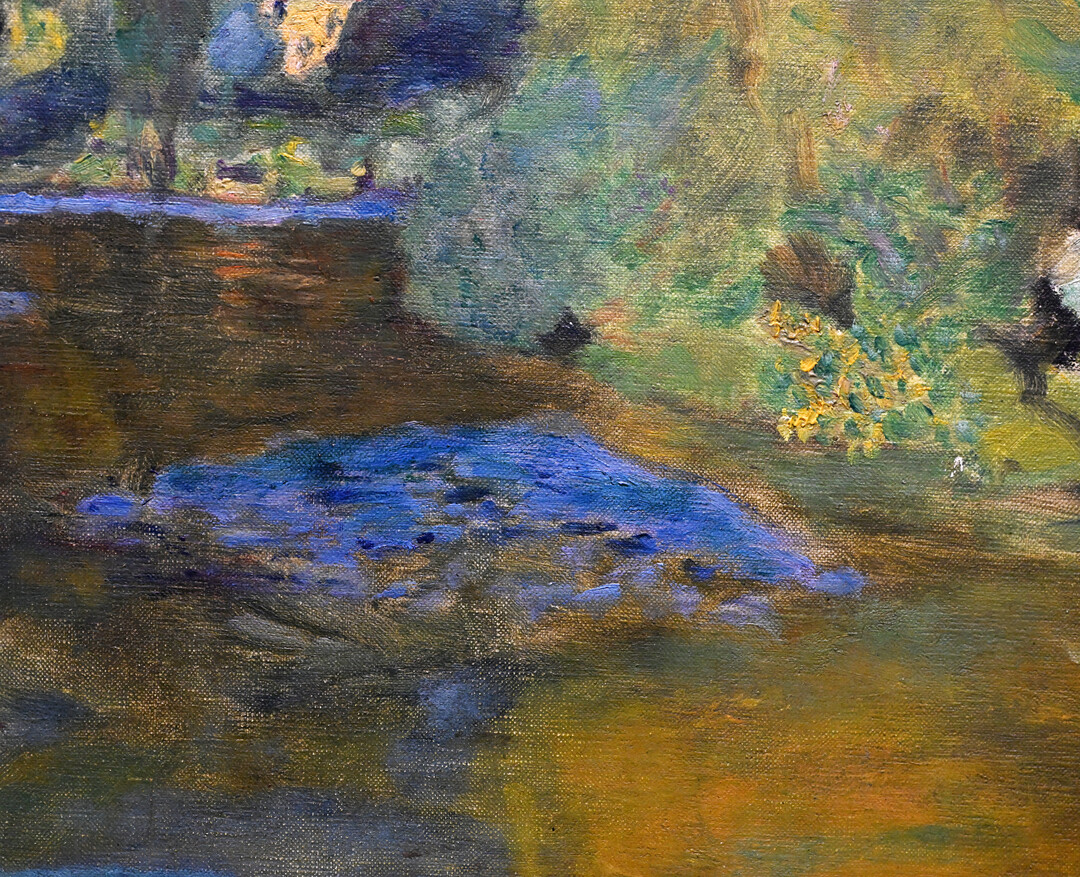 특히 이 작품에서 주목할 점은 보나르가 구사한 '시각적 진동' 효과다. 보색 관계에 있는 색들을 인접 배치하고, 윤곽선을 흐리게 처리하여 색채들이 서로 떨리듯 상호작용하게 만들었다. 수면의 청색과 나뭇잎의 황금색, 그림자의 자주색과 햇빛의 주황색이 충돌하며 만들어내는 시각적 리듬은 정지된 캔버스 위에서도 살아 숨쉬는 듯한 생동감을 전한다.