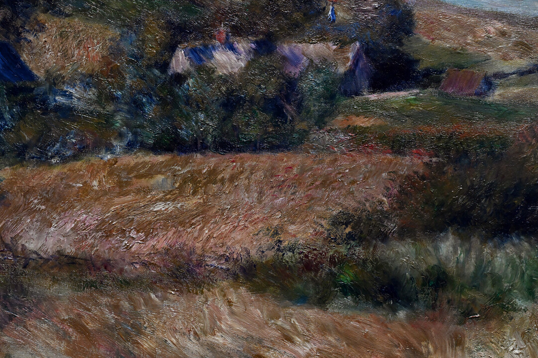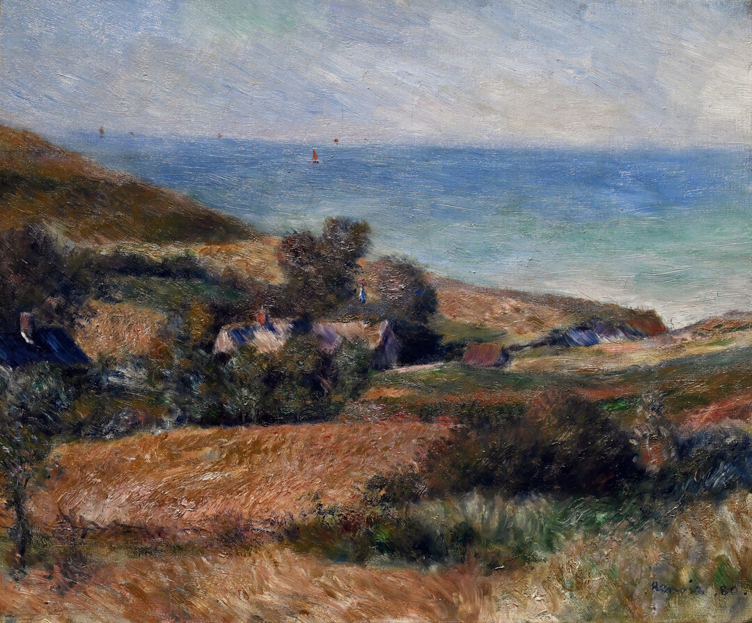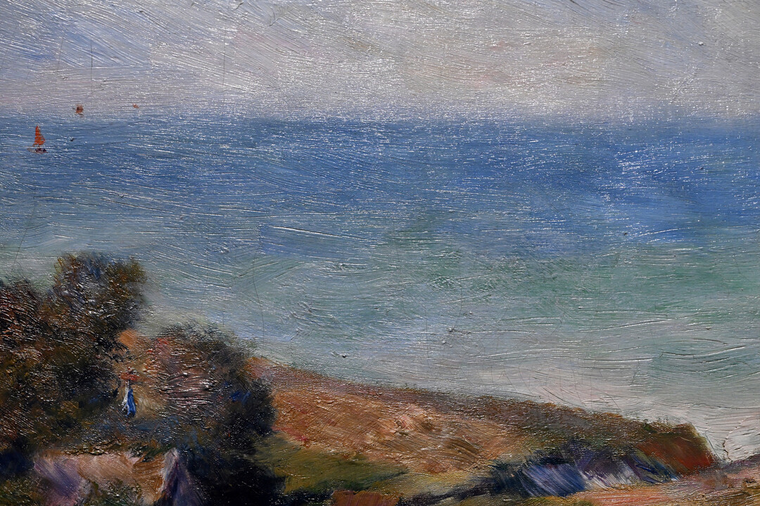 르누아르 특유의 자유로운 붓놀림이 돋보이는 이 작품은 인상주의 전성기의 화법을 고스란히 담아냈다. 그는 검은색이나 갈색 대신 주변 사물에서 반사된 색으로 그림자를 표현했으며, 햇빛이 풍경에 미치는 순간적 효과를 포착하는 데 집중했다. 특히 언덕과 바다, 하늘이 만나는 부분에서 빛의 변화를 섬세하게 담아내 화면 전체에 생동감을 불어넣었다.