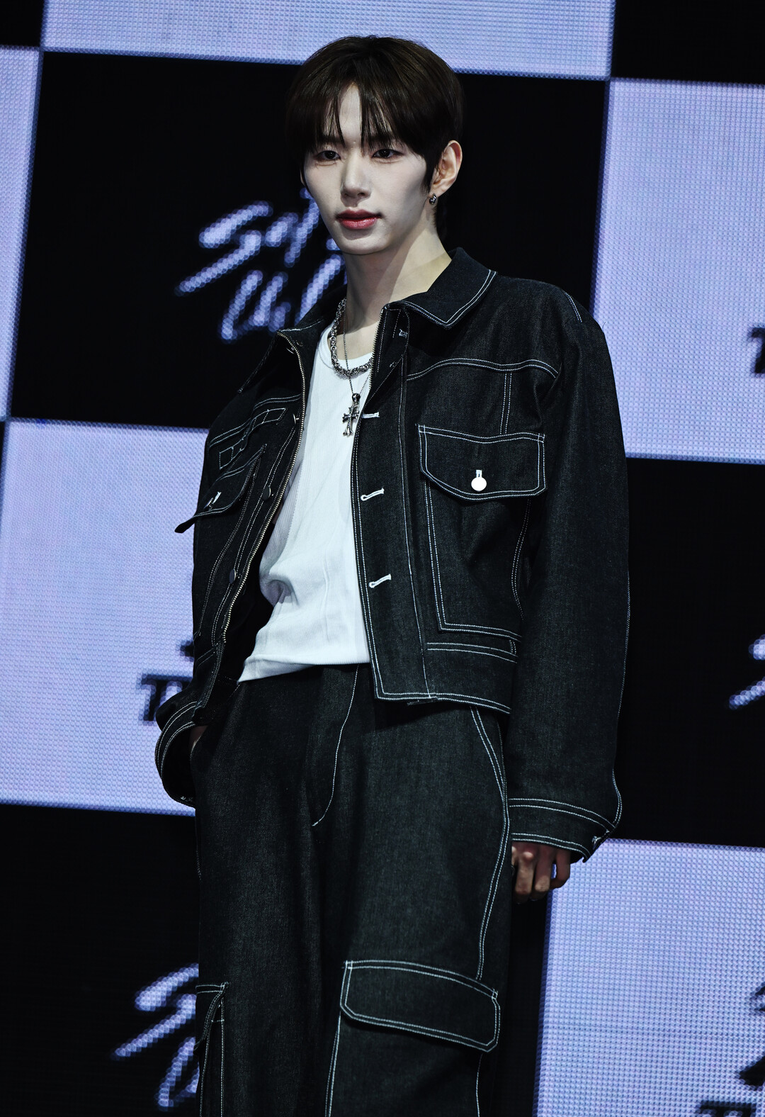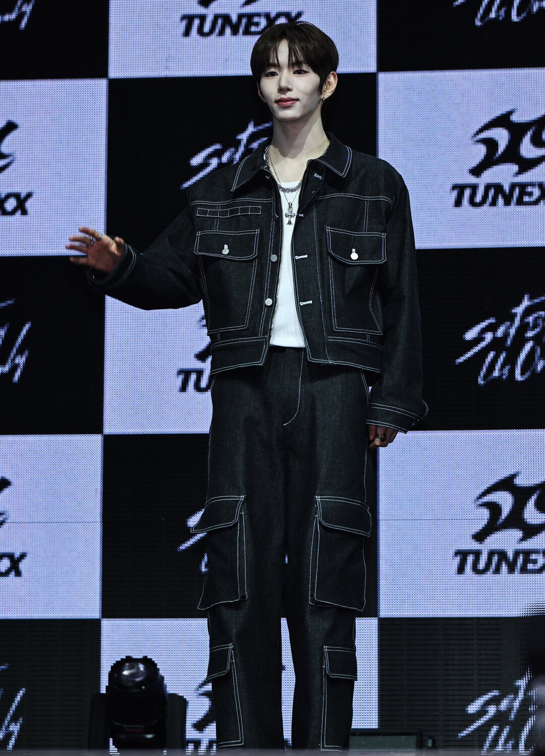 이날 성준 스타일링의 중심은 블랙 오버사이즈 데님 크롭 재킷이었다. 튜넥스 멤버들이 공유하는 화이트 스티치 블랙 데님 라인을 착용했지만, 성준의 재킷은 다른 멤버들 대비 확연히 짧은 크롭 기장이 눈에 띄었다. 허리선 바로 아래에서 끊어지는 크롭 기장이 성준의 긴 상체와 다리 비율을 극적으로 살려내며 전체 실루엣에 세련되고 현대적인 인상을 더했다.