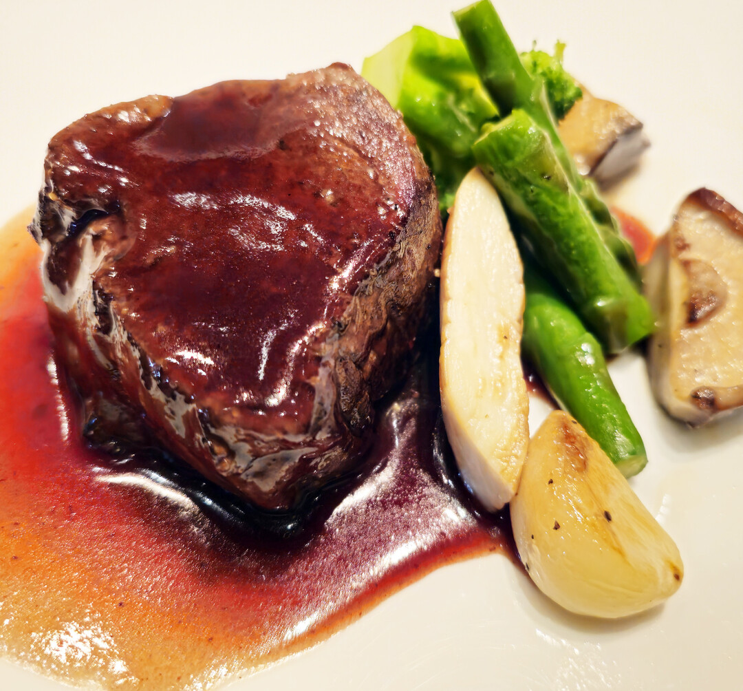 요리는 두툼하게 자른 안심을 미디엄 레어로 구워 육즙을 최대한 보존했다. 표면은 고온에서 시어링(searing)해 풍부한 마이야르 반응을 이끌어내 고소한 풍미층을 형성했다. 스테이크 위로 흐르는 레드 와인 소스는 와인을 졸여 농축시킨 뒤 데미글라스와 버터를 더해 깊이 있는 맛을 구현했다.