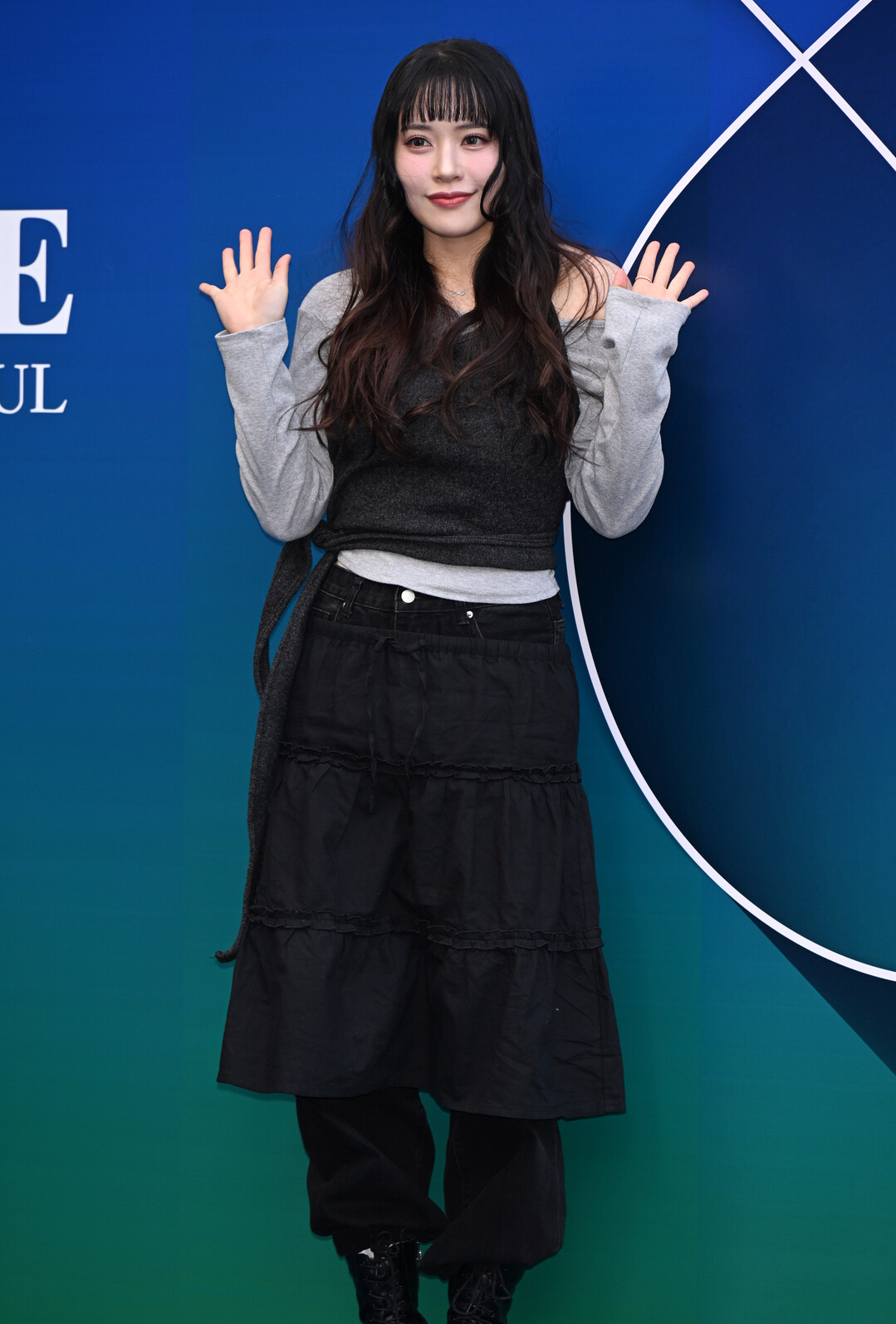 슬비의 하의는 블랙 티어드 스커트와 팬츠를 겹쳐 입은 독특한 조합이었다. 무릎 아래까지 내려오는 티어드 스커트는 3단 프릴 디테일이 적용되어 로맨틱한 감성을 표현했다. 각 티어 사이의 스티칭 라인은 수평으로 이어지며 시각적 레이어를 형성했고, 스커트의 볼륨감은 상체의 슬림한 실루엣과 대비를 이루며 균형 잡힌 비율을 만들었다.