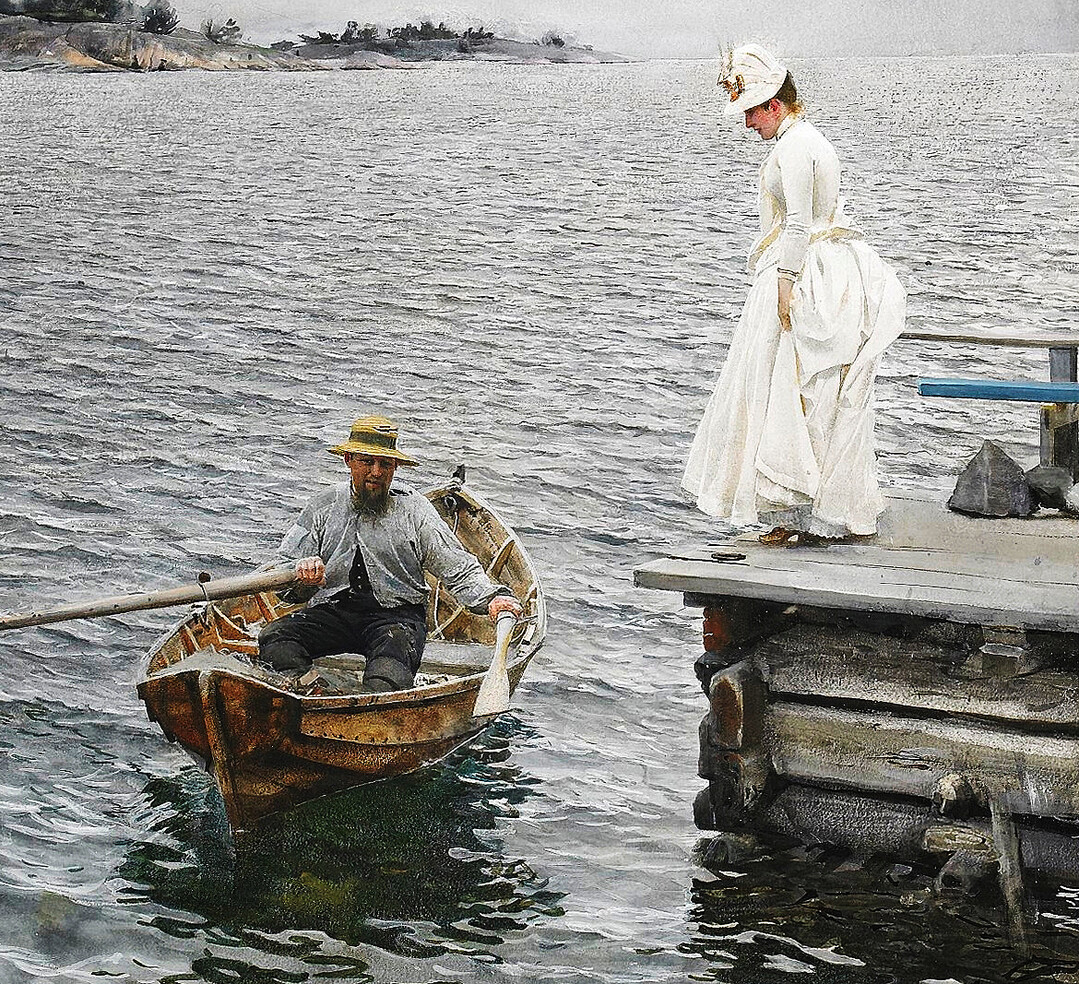 우아하게 차려입은 여성과 생업의 현장에서 온 남성이 부두 하나를 사이에 두고 마주하는 이 장면은, 19세기 스웨덴 사회의 계층 구조를 시각적으로 압축한 사회적 스냅숏이기도 하다. 가난한 농가 출신으로 상류층 사회에 진입한 조른 자신의 삶이 이 두 인물 사이 어딘가에 겹쳐진다. 그는 양쪽 세계를 모두 이해했기에, 그 어느 쪽도 낭만화하거나 희화화하지 않고 동등한 시선으로 담아낼 수 있었다.