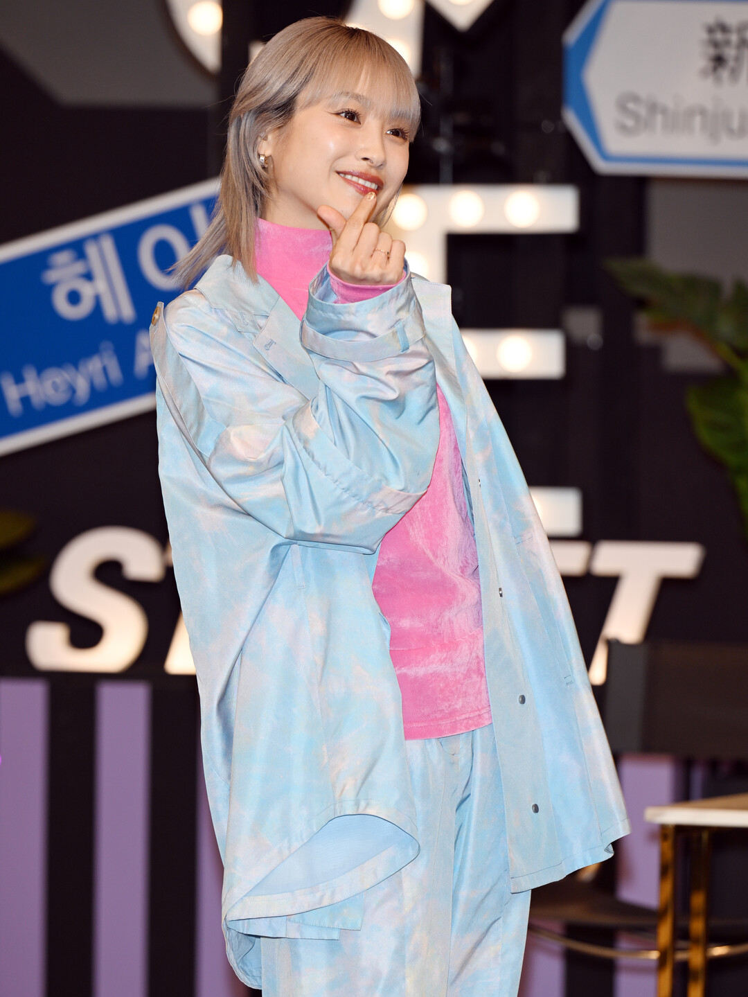 특히 소프트 핑크 컬러의 크록스 스타일 슈즈는 전체 스타일링의 포인트로 작용하며 캐주얼하고 친근한 이미지를 강조했다. 실버 애쉬 톤의 긴 생머리와 시스루 뱅 헤어스타일은 파스텔 톤 의상과 조화를 이루며 몽환적이고 사랑스러운 분위기를 극대화했다.