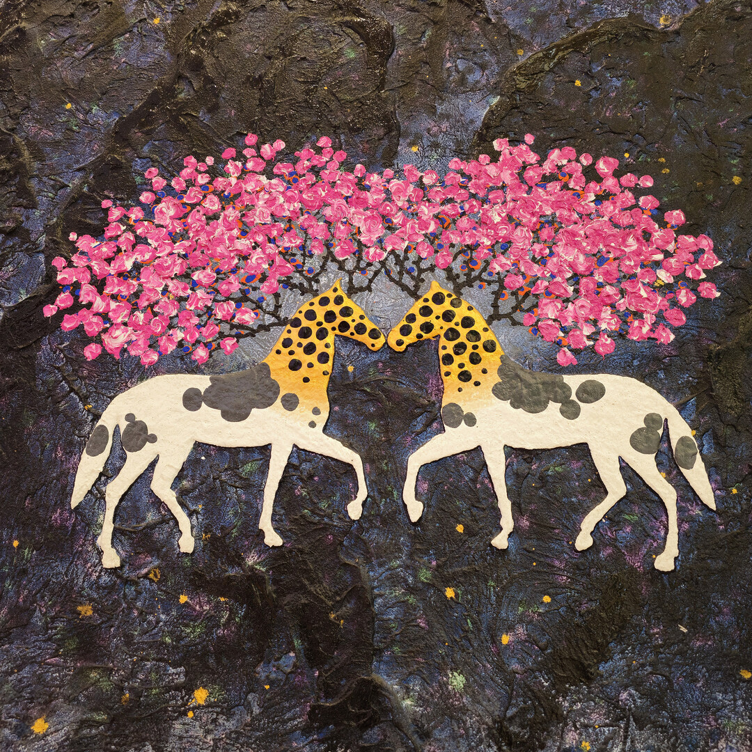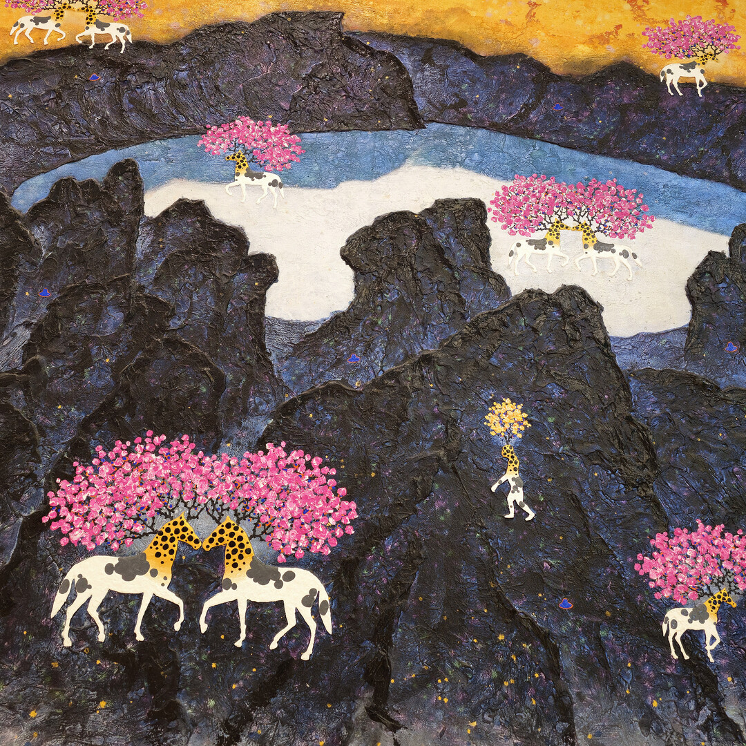 작품의 진정한 주인공은 화면 곳곳을 유영하는 유토피아적 동물들이다. 기린의 황금빛 목과 말의 몸체를 결합한 듯한 신수들이 머리마다 분홍빛 복숭아꽃 나무를 이고 암벽과 하늘 사이를 자유롭게 부유한다. 임근우 특유의 두껍고 역동적인 임파스토 기법으로 쌓아 올린 암벽의 질감은 고고학적 유적지를 연상시키는 동시에, 그 위를 걷는 신수들의 평면적이고 순백에 가까운 실루엣과 극적인 대비를 이룬다. 무겁고 장구한 역사의 시간 위에서 꿈과 이상이 피어날 수 있음을 시각화한 것이다.