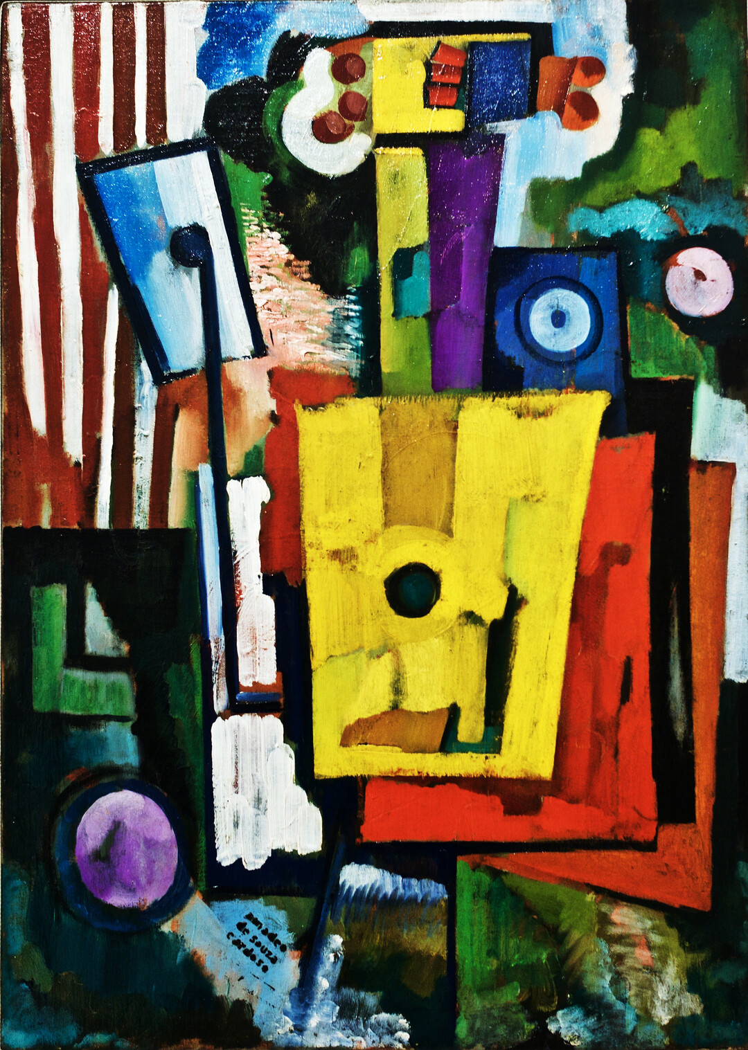 1916년작 'The Life of Instruments(악기들의 삶)'는 소자-카르도주의 원숙기를 대표하는 작품이다. 화면은 노랑, 빨강, 파랑, 초록, 보라가 충돌하고 공명하는 강렬한 색채의 장이다. 기하학적으로 분해된 형태들이 화면 전체를 가득 채우는데, 중앙에 자리한 황금빛 기타의 형태가 입체주의적 방식으로 해체되어 있으며, 좌측의 수직 줄무늬, 악기의 공명통을 암시하는 원형 모티프들, 그리고 중첩된 색면들이 리드미컬한 긴장감을 만들어낸다.