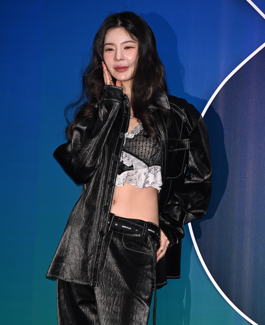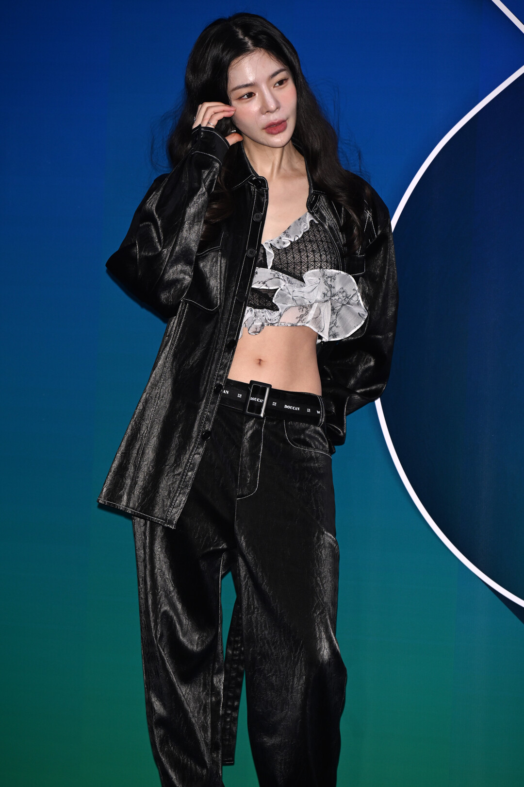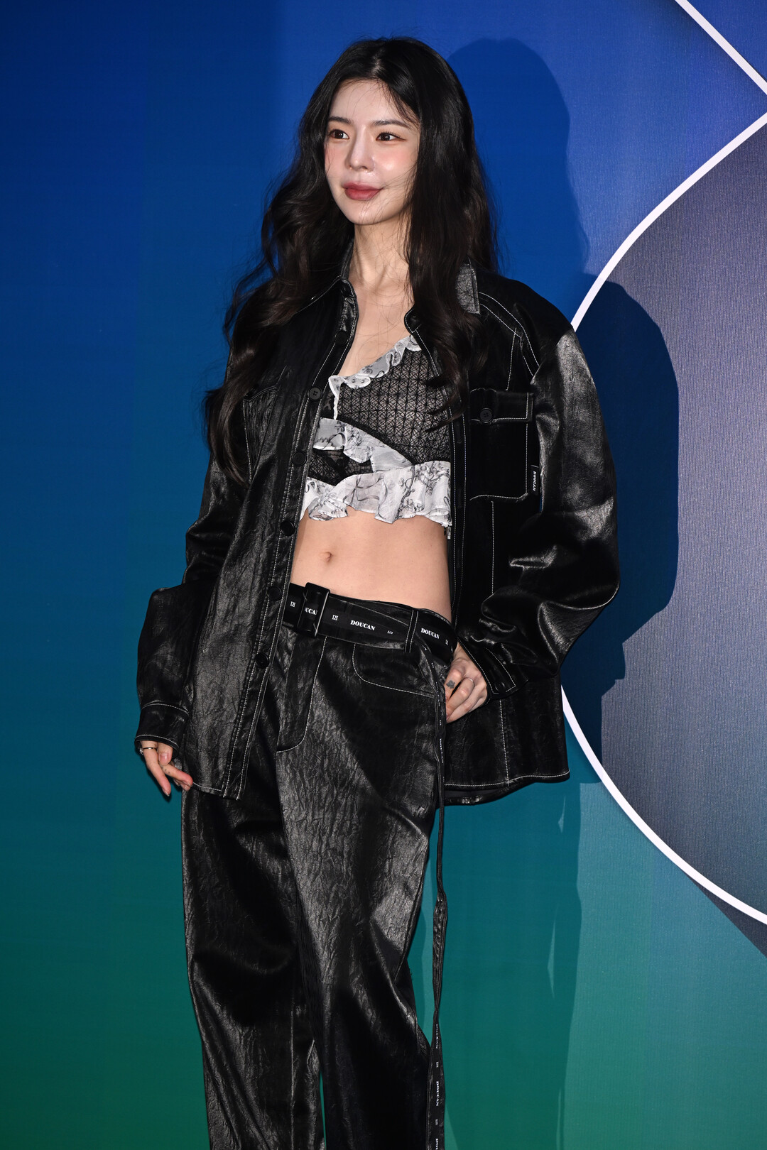 허리에는 'DOUCAN' 브랜드 로고가 새겨진 블랙 벨트를 착용해 포인트를 주었다. 벨트는 하이웨이스트 라인을 강조하며 상하체의 비율을 극대화하는 동시에, 브랜드 아이덴티티를 드러내는 스타일링 요소로 작용했다.